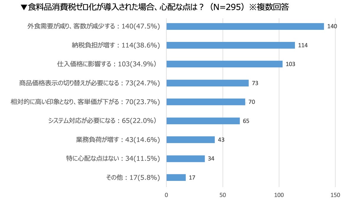その背景として、食料品消費税ゼロ化が導入された場合の心配な点を尋ねたところ、最も多かったのが「外食需要が減り、客数が減少する」(47.5%)、次に「納税負担が増す」(38.6%)、「仕入価格に影響する」(34.9%)など、懸念点が多岐にわたっていることが分かりました。