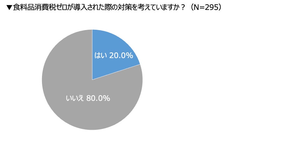 最後に、「食料品の消費税ゼロ」が導入された場合の対策を考えているかを聞いたところ、「はい(考えている)」と回答した飲食店は20.0%にとどまり、「いいえ(考えていない)」は80.0%となりました。