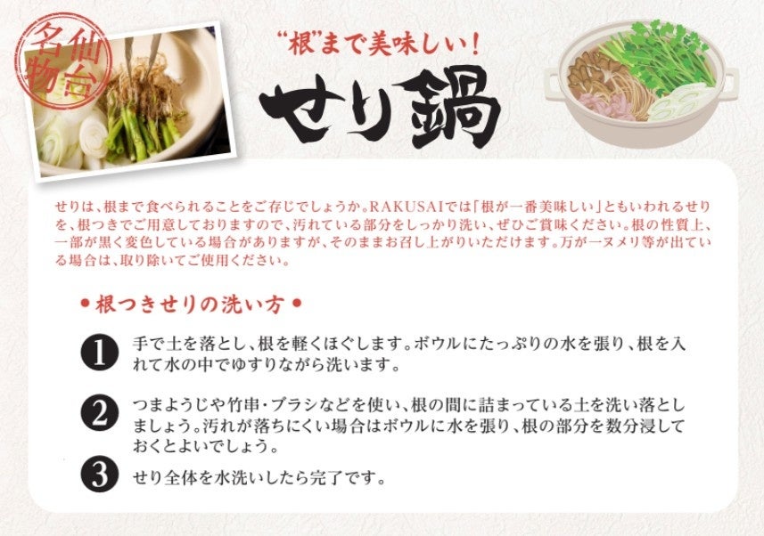 楽彩株式会社(本社:東京都足立区/代表取締役社長:大﨑善保)は、2026年2月9日(月)の「肉の日」より、昨年11月の発売時に完売となった大人気商品『厳選野菜と鴨肉のせり鍋セット』を、楽彩オンラインショップにて300セット限定で予約販売いたします。本商品は、「仙台せり」を根まで贅沢に使用し、旨味あふれる鴨肉と合わせたこだわりの逸品です。「もう一度食べたい」という多くのお客様からの熱いご要望にお応えし、まだまだ寒さが厳しいこの季節に、心も体も温まるプロの味を、ミールキットの手軽さはそのままにご家庭へお届けいたします。