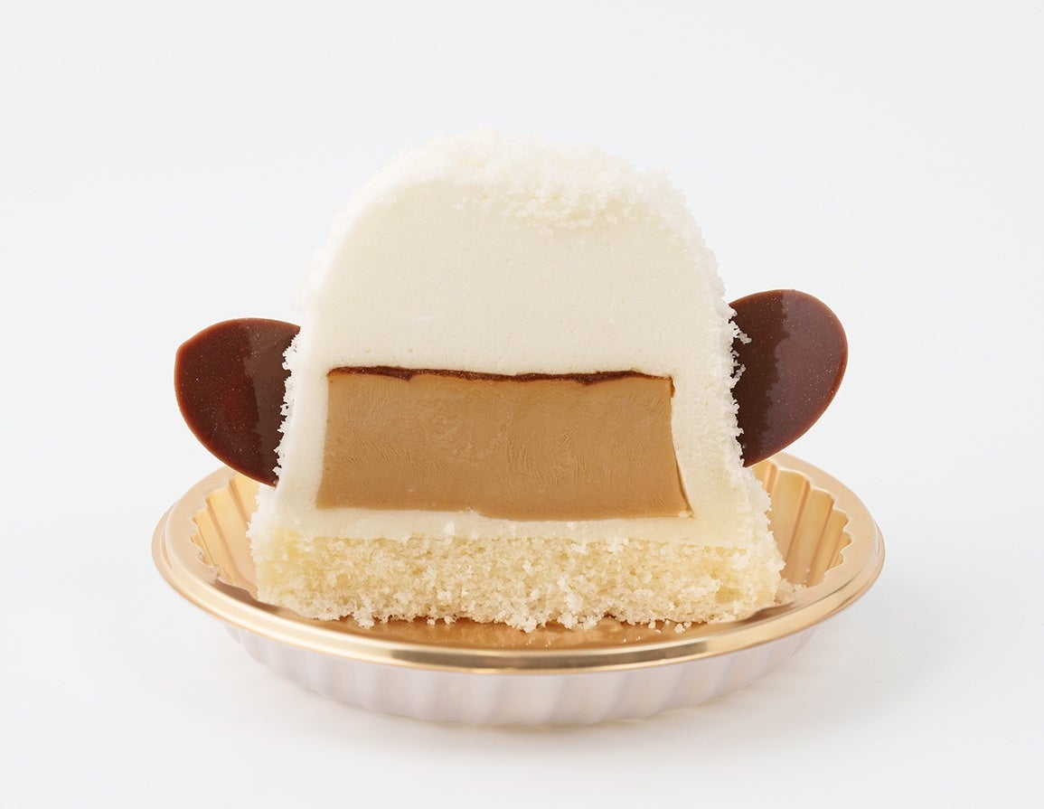 名古屋コーチンの卵を使ったロイヤルミルクティー味の濃厚なプリンを、ホワイトチョコレート味のババロアで包み、白いスポンジのクラムをまとわせました。