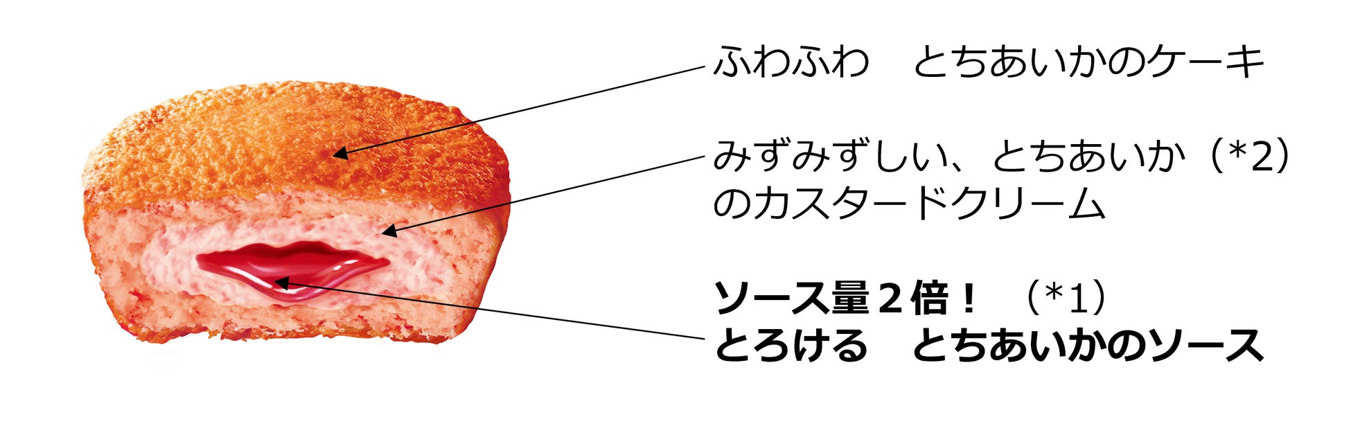 ふわふわのとちあいかのケーキの中には、みずみずしい、とちあいかカスタードクリームと、従来品より2倍量(*1)のとろける、とちあいかソースをたっぷりと閉じ込めました。