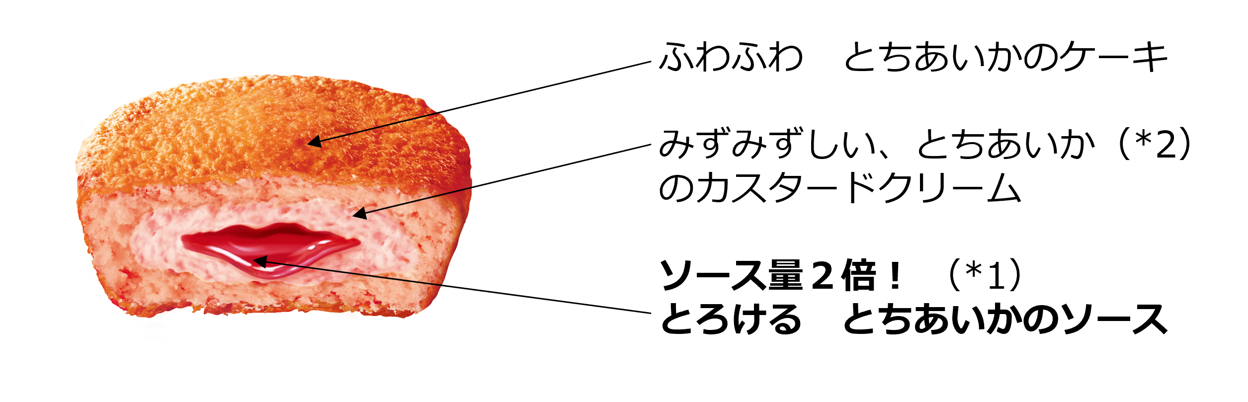 ふわふわのとちあいかのケーキの中には、みずみずしい、とちあいかカスタードクリームと、従来品より2倍量(*1)のとろける、とちあいかソースをたっぷりと閉じ込めました。