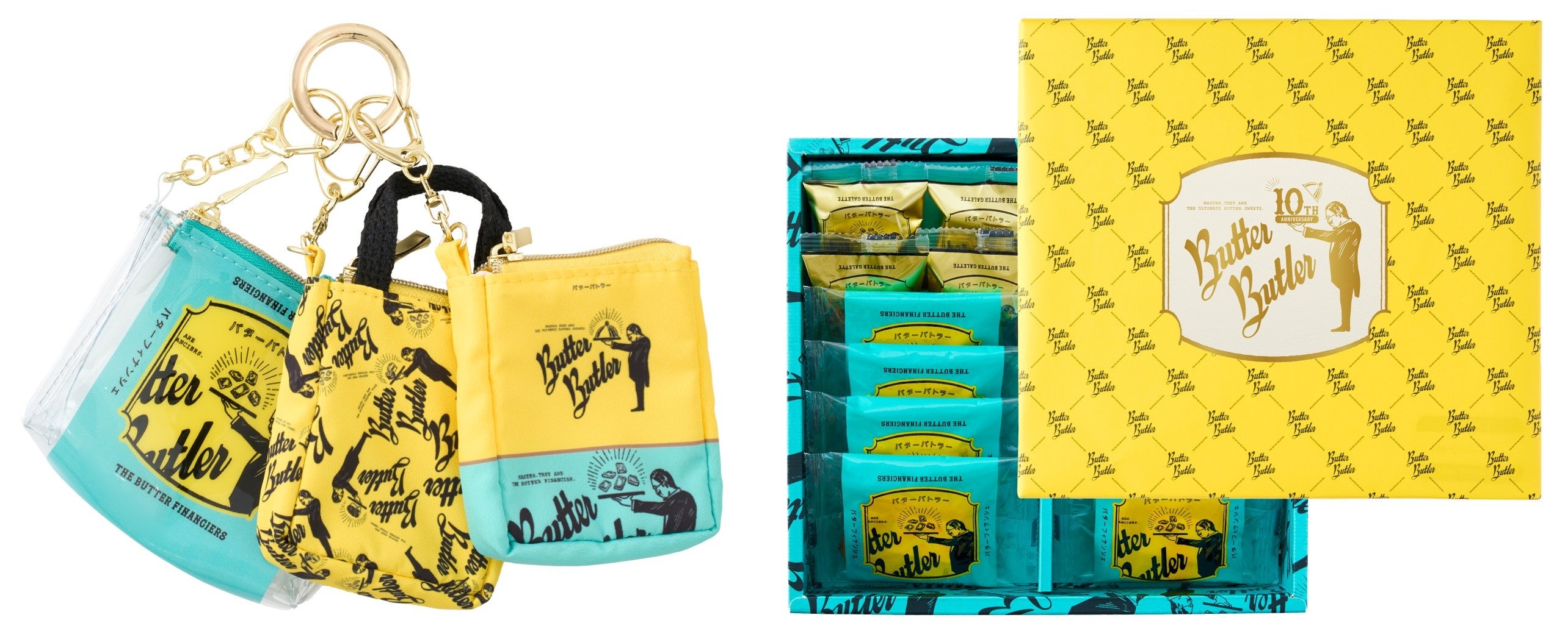 ご主人様。「バターフィナンシェ」と「バターガレット」の詰合せが、10周年限定パッケージとして登場いたしました。感謝を込めて差し出すクローシュの中から『10th ANNIVERSARY』が現れる、節目を祝う特別なデザインに仕上げております。さらに、10周年限定のノベルティキーホルダーもご用意。