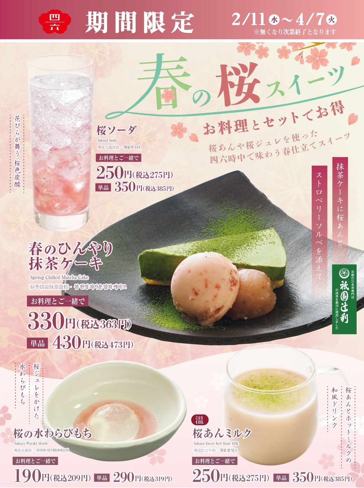 ※価格は単品価格です。桜スイーツはお料理とご一緒にご注文で110円(税込)割引になります。