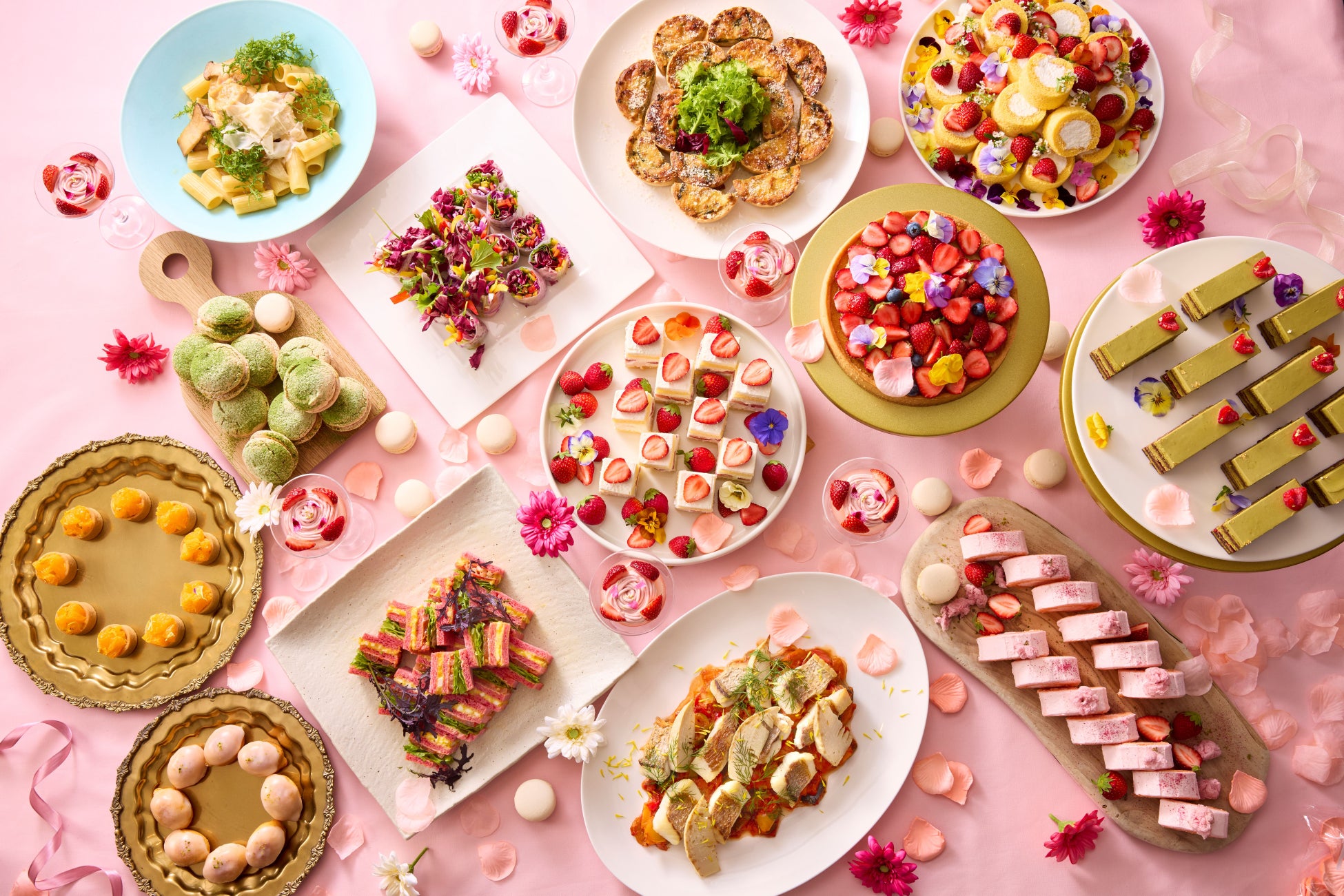 長崎県産の苺をふんだんに使った「苺ショートケーキ」や「苺タルト」をはじめ、「桜のロールケーキ」や「ピスタチオオペラ」など、春の訪れを感じるスイーツが並びます。あわせて「春の菜の花キッシュ」や「ツナと卵のピンクのサンドイッチ」といった、季節感あふれる多彩なセイボリーもご用意いたしました。