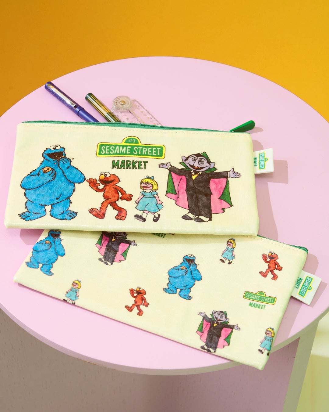 どこか懐かしく、あたたかみのあるイラストが目を惹くペンポーチ。クッキーモンスター、エルモ、プレーリー・ドーン、カウント伯爵が集合したアートとブランドロゴを大胆にプリントしたデザインと、総柄デザインの2種をご用意しました。ファスナー部分のグリーンカラーがさりげないアクセントを添えてくれます。