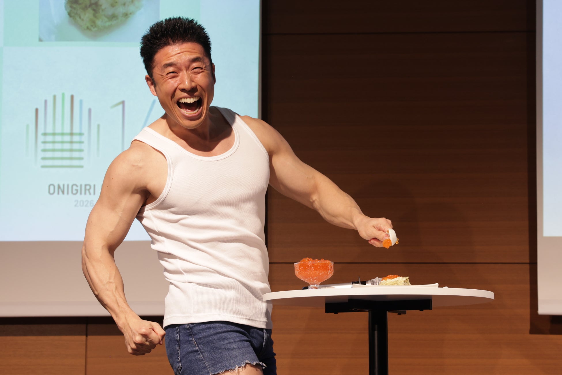 続く2回目では「ヤーーーー!!!」の掛け声で、大量のいくらがはいっている器をひっくり返しましたが、くっついてしまい一粒も落ちないというハプニングも。最後は、れんげでいくらをすくい、「知床朧いくらおにぎり スペシャル”追い”いくらトッピング」が完成! 自分でつくったおにぎりを食べ「口の中に贅沢が広がりまくっています。」とコメント。司会から「パワー感じますか?」の振りに「ん?あ、自分のギャグ忘れてた! 忘れるくらいおいしいおにぎりでした。パワーーー!!」と締めくくり、イベントは大盛況のうちに幕を閉じました。
