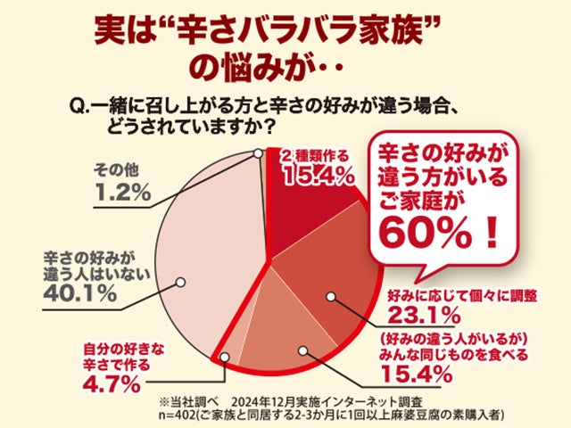 ・一方で、麻婆豆腐を作る際には「家庭内での辛さの好みの違い」に対する悩みを抱えているご家庭が60%もいることが当社の調査でわかりました。こうしたご家庭では、辛さの異なる麻婆豆腐を2種類作る手間をかけたり、どちらか一方の好みに合わせて妥協したりすることで、「辛さの好みの違い」の問題に対処していました。また、ただ辛さを足すために辛味調味料を加えるだけでは、味のバランスが取れないという意見もありました。