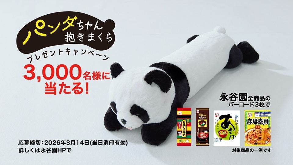 株式会社 永谷園(社長:掛谷 浩志、東京都港区)は、全長110cmmのギュッ♪と抱きしめたくなる「パンダちゃん抱きまくら」 が3,000名様に当たる「パンダちゃん抱きまくらプレゼントキャンペーン」を実施しております。新CM「パンダちゃん抱きまくらプレゼント篇」は2026年2月7日(土)より放映中です。