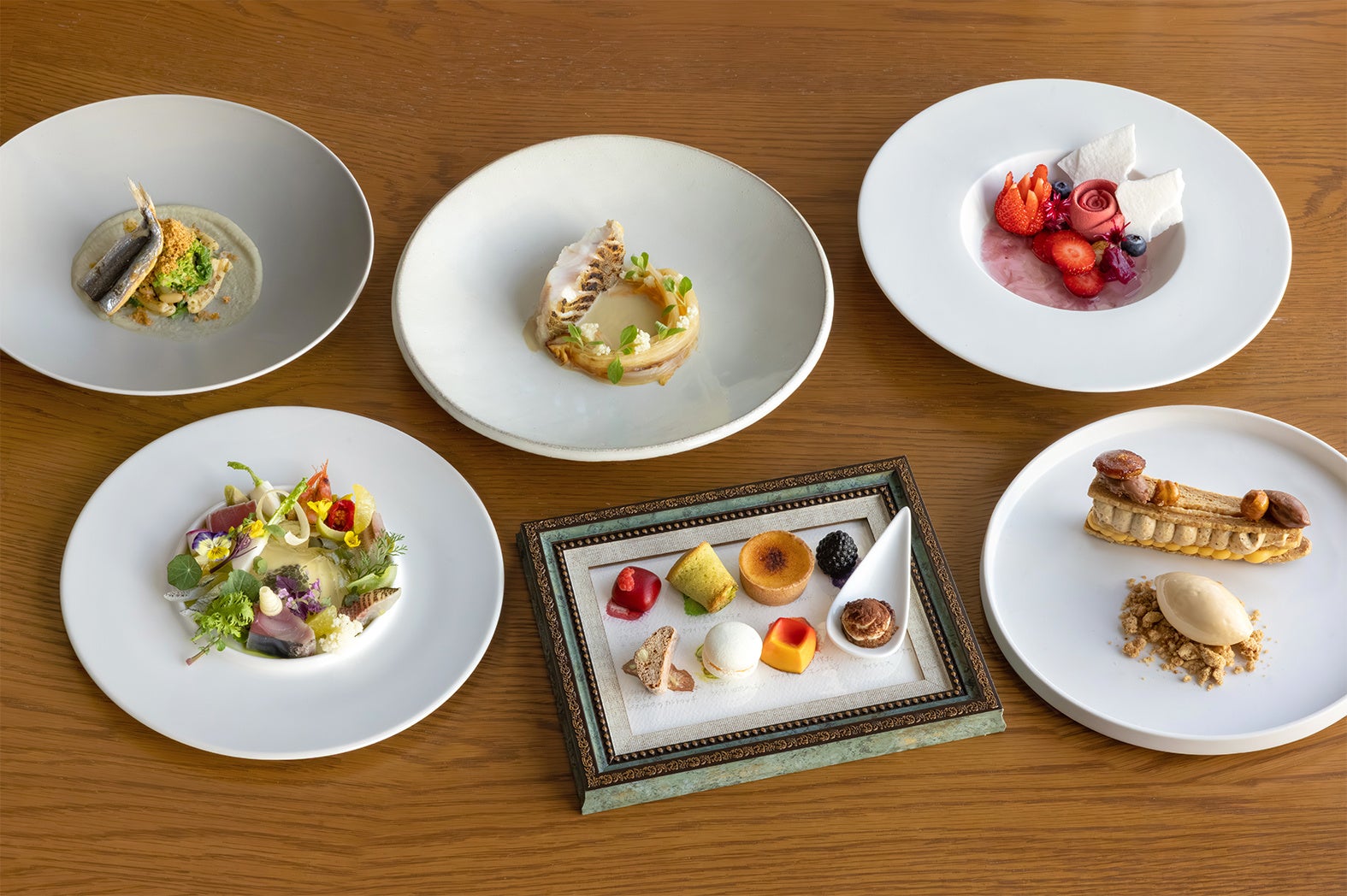 お食事の後は、アフタヌーンティー仕立てのデザートがスタート。旬のフルーツを使った一皿、ミルフィーユなどのケーキを楽しんだ後は、とっておきのデザートが登場します。小菓子に隠れたシェフの遊び心をお楽しみください。