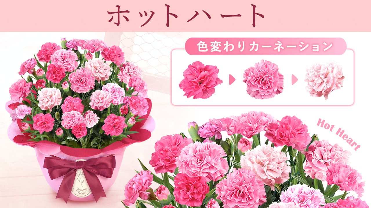 株式会社おいもや(本社:静岡県掛川市、代表取締役:関谷夕佳)は、2026年の母の日(5月10日)に向け、トレンドカラーに基づいたカーネーションの予約販売を1月24日に開始しました。一般社団法人日本流行色協会(JAFCA)が発表した2026年の色「ハートフェルト・ピンク(Heartfelt Pink)」に注目し、そのテーマである「活力」「安らぎ」を体現する品種として、色が変化する『ホットハート』や、優しい色合いの『メープルシフォン』を展開しています。