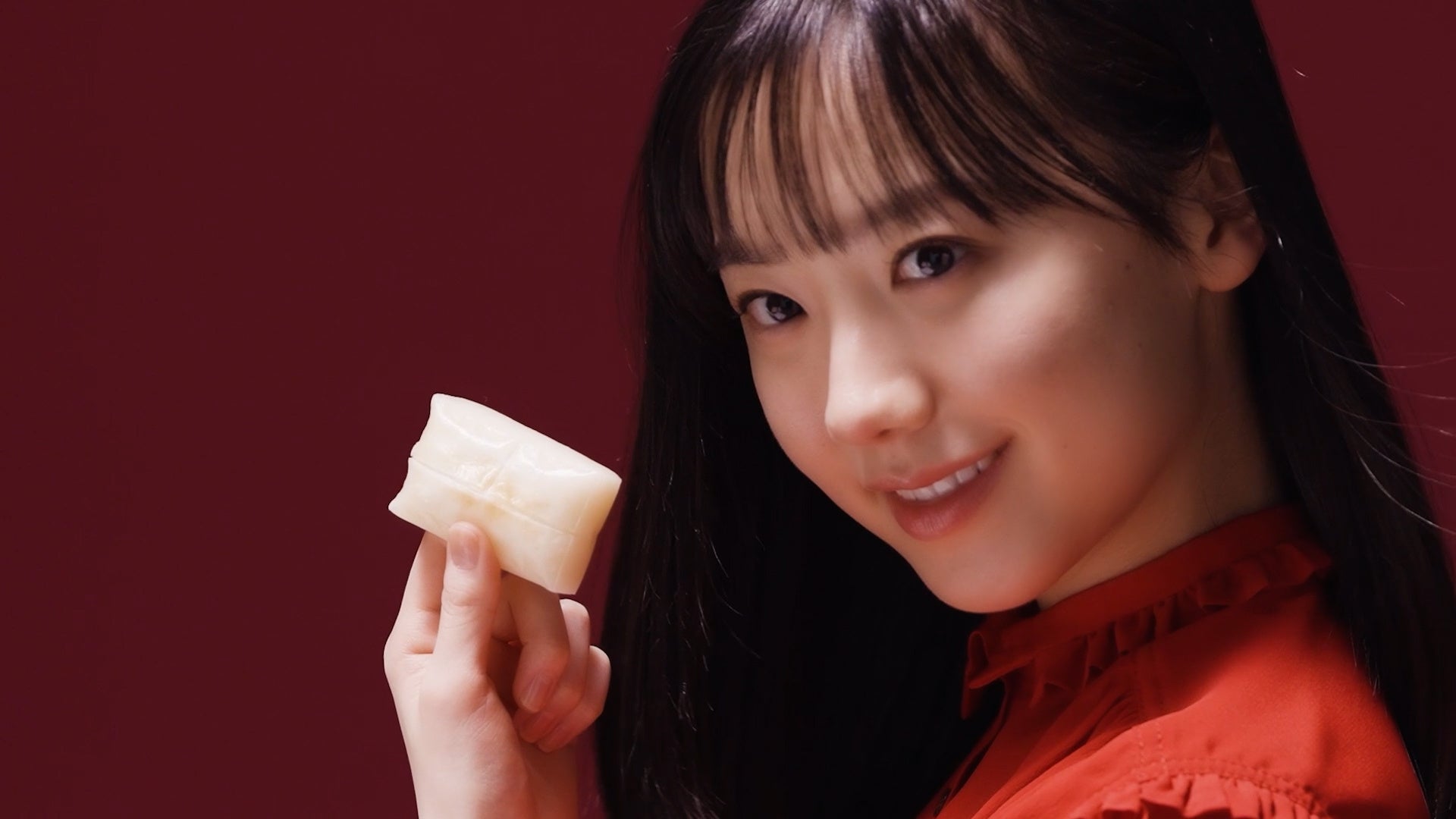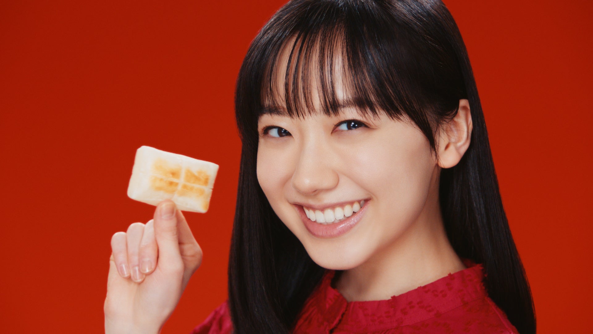 サトウ食品のコーポレートカラーである“赤”の衣装を身にまとい、お餅を手に振り向く印