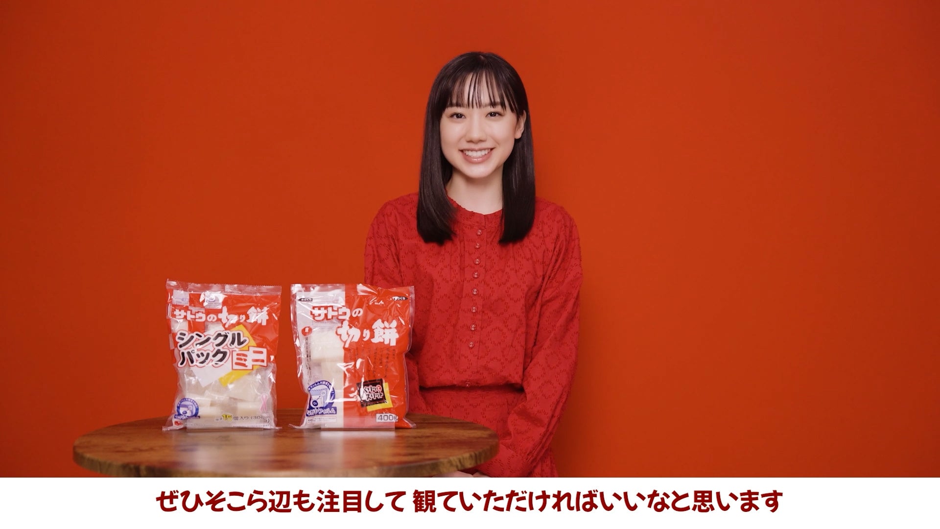 サトウ食品のコーポレートカラーである“赤”の衣装を身にまとい、お餅を手に振り向く印