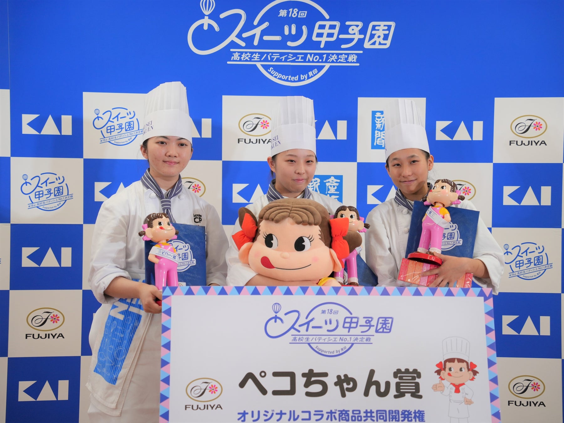 2025年9月15日(月・祝)に「第18回スイーツ甲子園」の全国大会決勝が行われ、西日本、東日本の各予選ブロックから勝ち進んだ6チームが出場。優勝(文部科学大臣賞)のほか、各協賛社より賞が贈られました。育成調理師専門学校高等課程のチーム「エクラフィエール」は「優勝」と「ペコちゃん賞」をダブル受賞し、コラボ商品開発権を獲得しました。