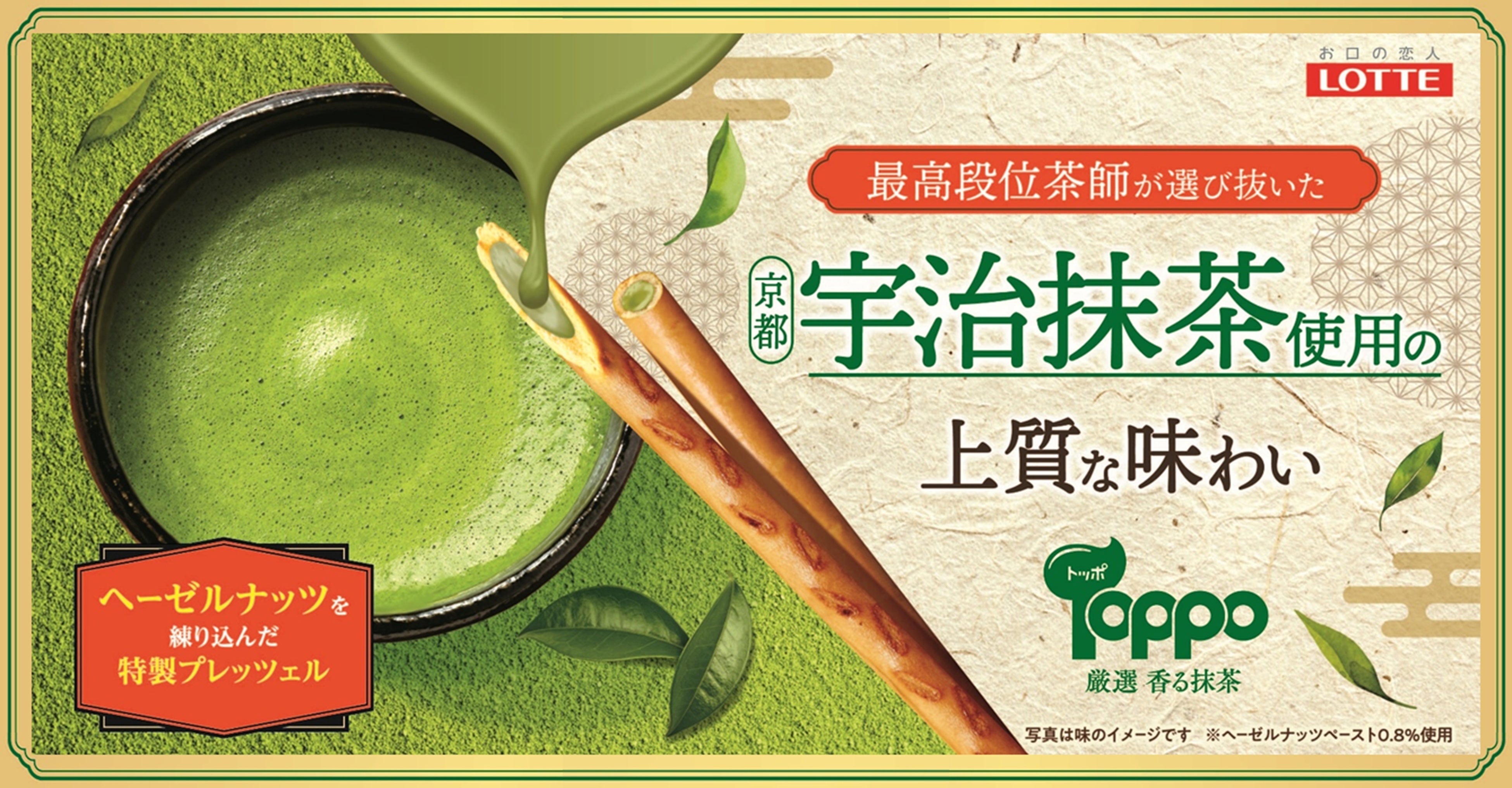 株式会社ロッテ(東京都新宿区、代表取締役社長執行役員:中島英樹、以下ロッテ)は、「トッポ<厳選香る抹茶>」を2月17日(火)より発売します。本商品は、トッポの抹茶フレーバーとして約3年ぶりの発売となります。過去に発売した抹茶フレーバーもご好評をいただいており、待望の復活となります。最高段位茶師が厳選した京都宇治抹茶を使用し、香ばしいヘーゼルナッツを練り込んだ特製プレッツェルに、京都宇治抹茶のやさしく深い香りが広がるチョコレートをたっぷりと閉じ込めました。