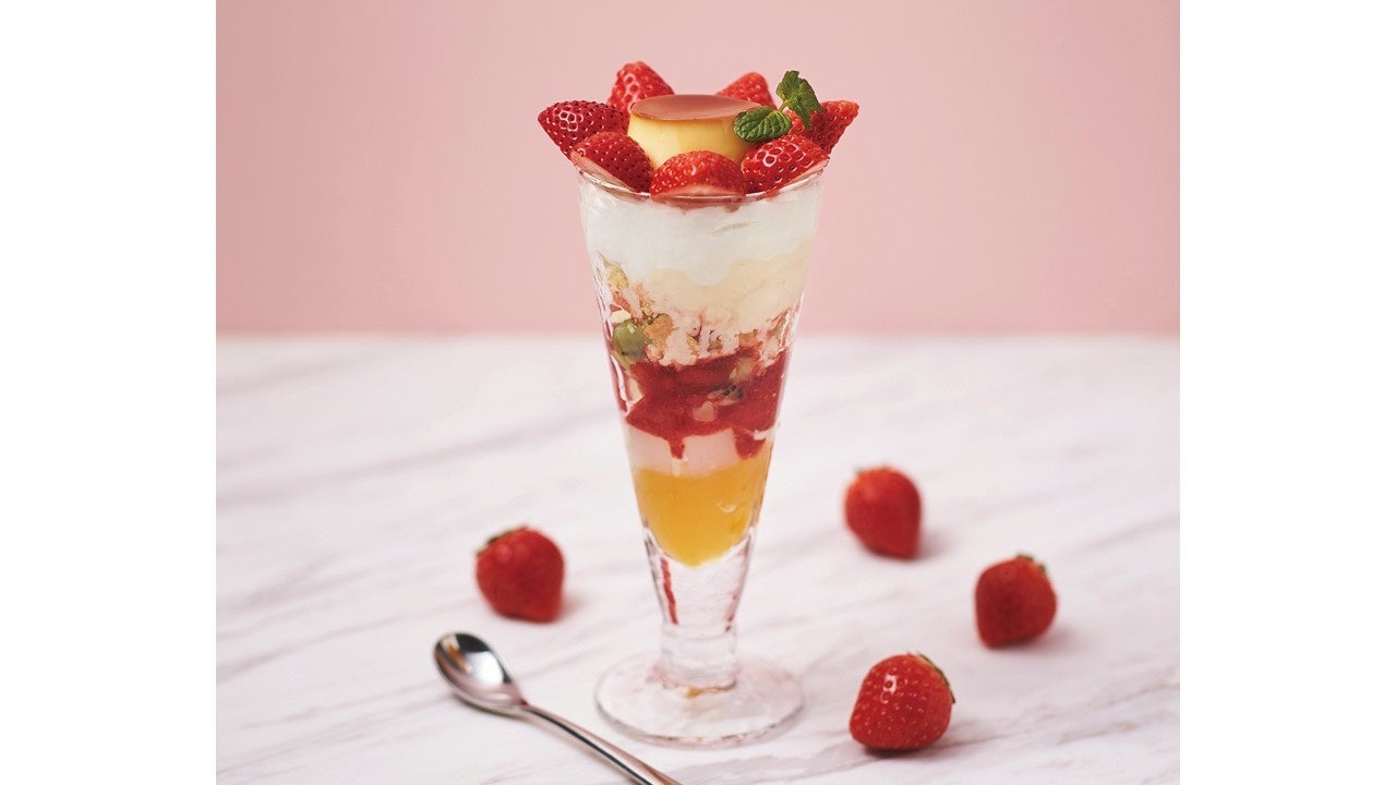 カスタードプリン(ミニ)とバニラアイスクリーム、オレンジゼリーと旬のいちごで仕立てた期間限定パフェです。