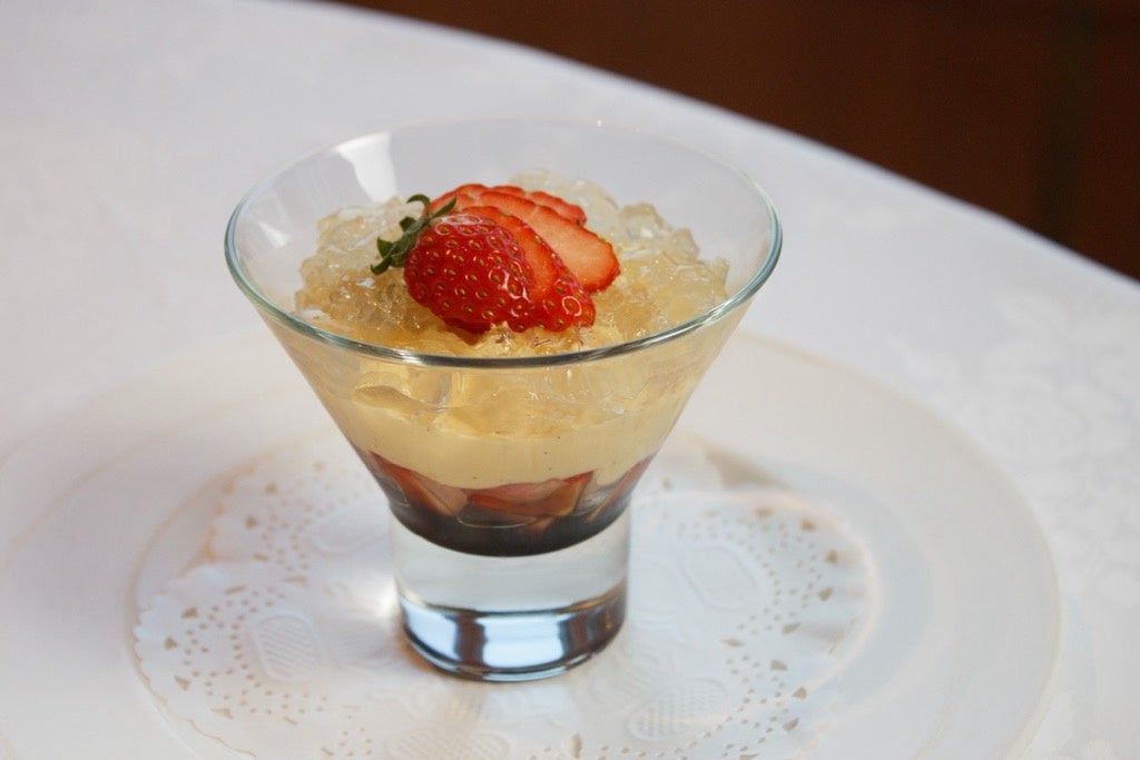 鳥取県産の西尾農園から直送した”とっておき”いちごとイタリアモデナ産の高級バルサミコを使用した甘酸っぱくさっぱりとしたドルチェ。カスタードクリームをからめてお召し上がりください。