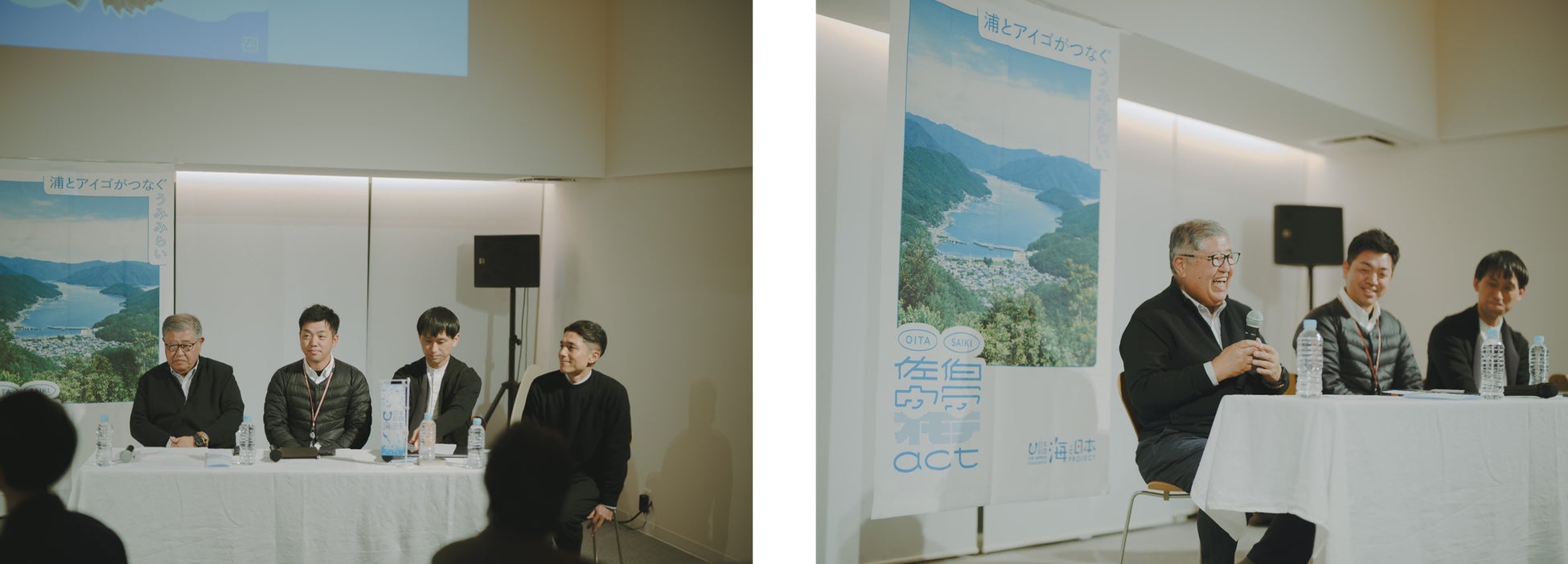 トークセッションでは、冒頭に佐伯ウラオモテアクトの河野代表によるこれまでの取組紹介を実施。2023年からの3年間アイゴをテーマに取り組んだ海洋体験企画や学校給食・飲食店との連携、商品開発等の事業の説明を行い、株式会社やまろ渡邉の渡邉会長にはこれまでのアイゴを活用した取組の歩みや、その中での技術の進化や商品の展開などをお話いただきました。株式会社良品計画の松木氏には、アイゴを含めた未利魚と分類される魚種の捉え方や活用方法など、広い視点での海に対する想いを伝えていただきました。