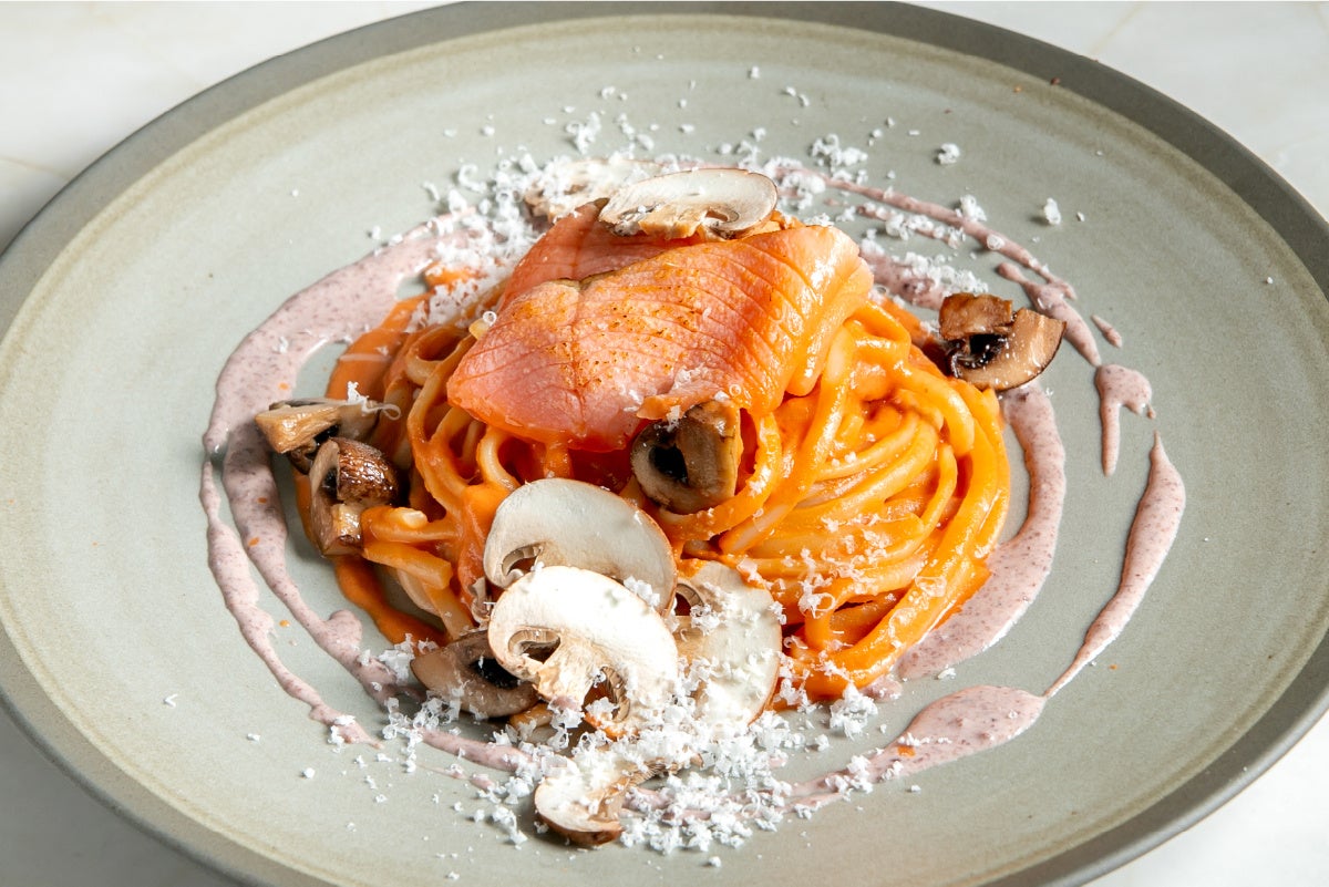 濃厚な旨味が特徴の長時間燻製のフィヨルドサーモンと六甲マッシュルームが好相性。