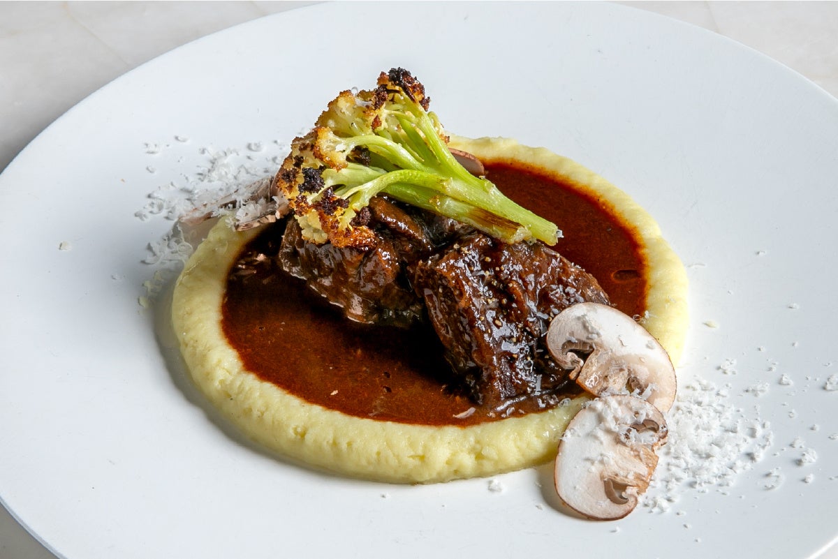 濃厚な赤ワインソースで炊き上げた牛ホホ肉のビーフシチュー。