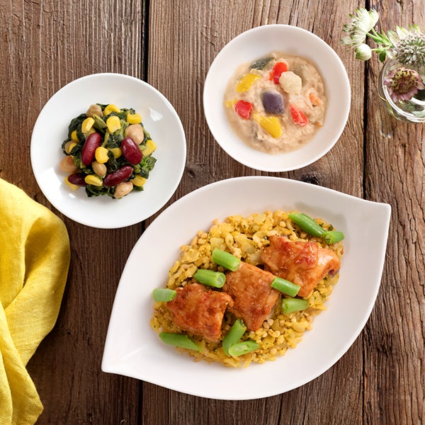 スパイス香るインド風カレーピラフに、香ばしく焼き上げたタンドリーチキンをトッピングした満足感のある一皿です。お米に大豆ミートをブレンドすることで、豊かな風味はそのままに、パラパラ食感を実現。仕上げにパクチー、フライドオニオン、赤玉ねぎを添え、本格的な香りと味わいをプラスしました。
