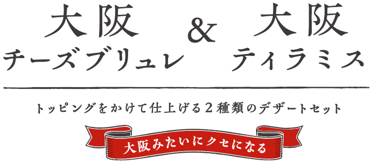 大阪みたいにクセになる!でおなじみの「大阪チーズブリュレ」と「大阪ティラミス」を一度に楽しめるセットにしました。それぞれ、別添のトッピングをかけてお楽しみください♪
