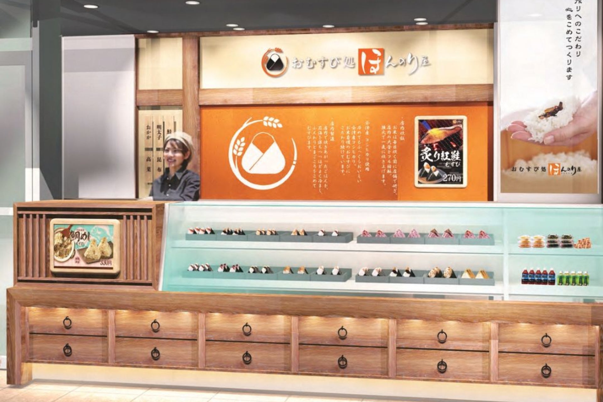 JR東日本のエキナカに展開するおむすび処。2002年3月、東京駅八重洲中央口改札内に第一号店となる「ほんのり屋 東京本店」を開業。首都圏を中心に店舗を広げています。「店内炊飯」「手づくり」「会津産コシヒカリ」3つのこだわりを大切にしながら、こだわりのおむすびを提供し続けています。
