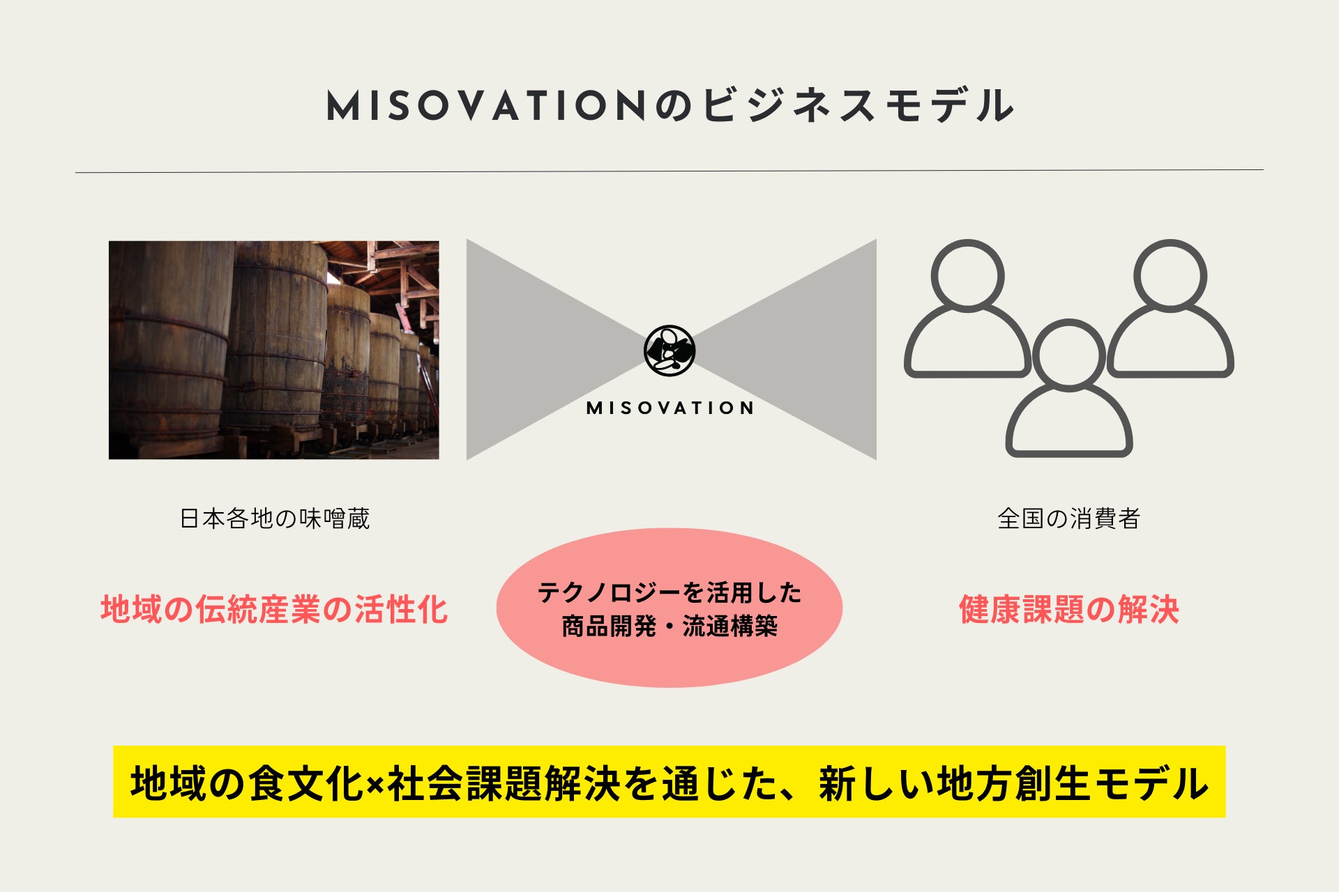 特に地方には、生産者の情熱が詰まった素晴らしい伝統食が数多く存在しますが、販路開拓のノウハウ不足や物流の課題により、その多くは地域内での流通に留まっています。 MISOVATIONはこれまで、オンライン×サブスクリプションというD2Cモデルを通じて、栄養価の高い「味噌」を活用した完全栄養食などを展開し、地域の蔵元の味を消費者に届けてまいりました。しかし、産業全体の活性化を目指すには、オンラインの枠を超えたより広い流通網の構築が不可欠です。