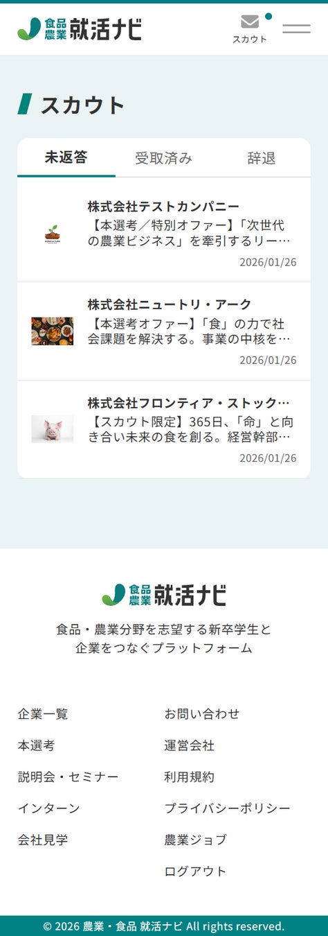 本機能は、企業が自社の採用方針や求める人物像に合った学生に能動的にオファーを送ることができる仕組みです。従来の求人掲載やイベント告知といった「待ち」の採用手法に加え、学生一人ひとりに向けて想いを届けることで、食品・農業分野における新卒採用の可能性を広げます。