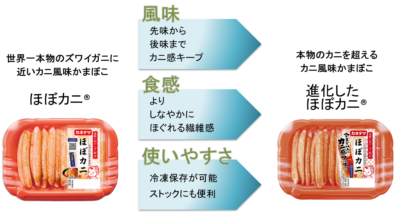 ①カニの風味を強化(今まで以上にカニ感アップ!)