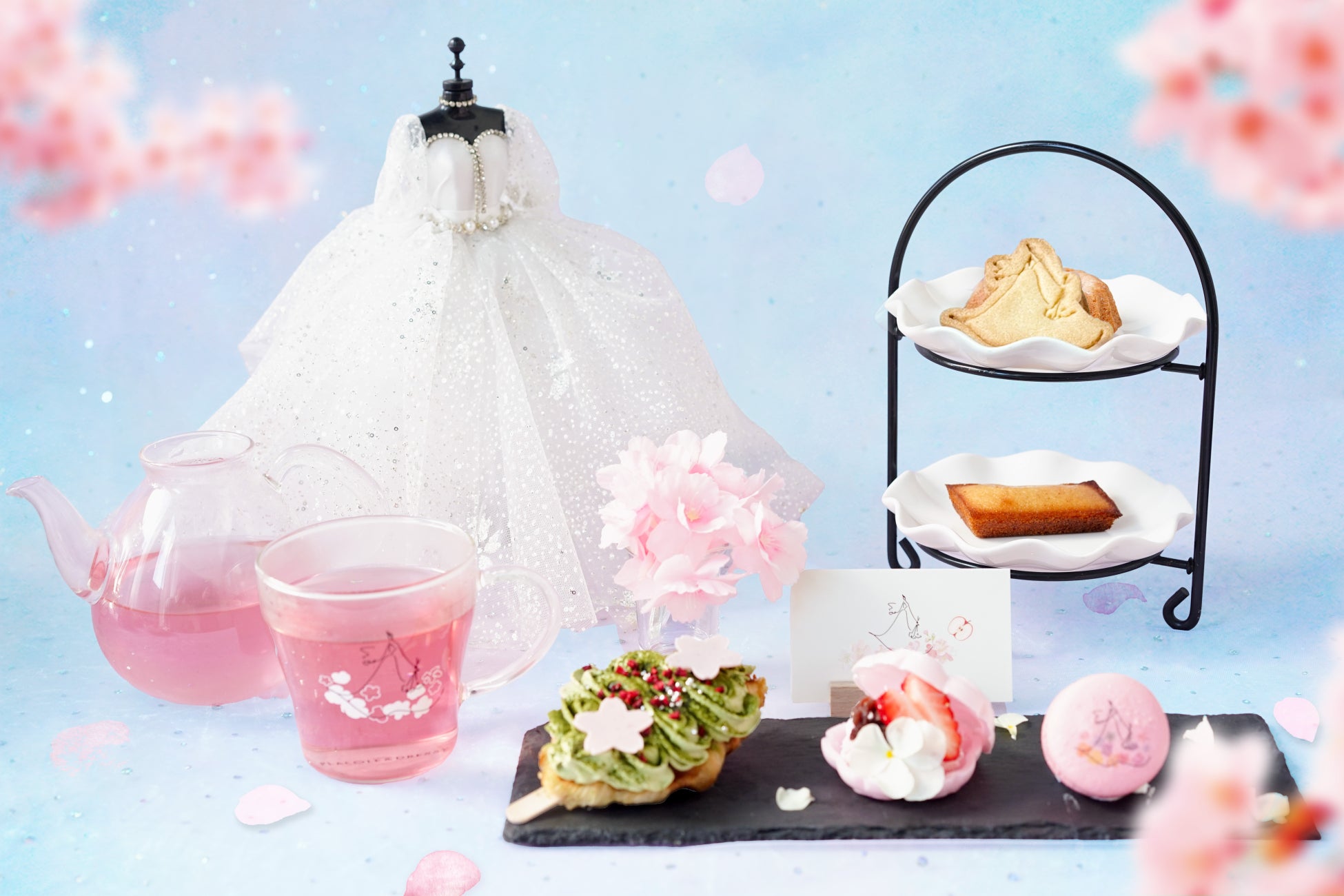 華やかなドレス装飾を間近に感じられる店内で、優雅なひとときをお過ごしいただける『お花のアフタヌーンティーセット』。春を感じるサクラロールケーキや、サクラシロップを使用したきらめくオリジナルゼリー、イースタモチーフのドラジェがのった抹茶タルト、ピンクで彩られたロールケーキなど、物語の世界を思わせるキュートなスイーツがティースタンドを彩ります。さらに、ジャムが隠し味のサクラや抹茶のオリジナル“ジュレマカロン”もセットに。一足早くお花見気分を味わえるサクラの世界観を存分に感じていただける、シーズン限定のスペシャルなアフタヌーンティーです。