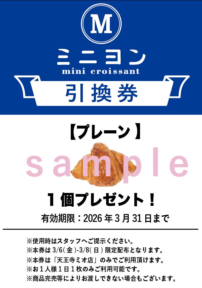 各店舗いずれも1日1万個以上のクロワッサンを販売し、連日行列の絶えない人気店に成長をしております。こうした人気を受け、この度、関西で2店舗目となるミニヨン 天王寺ミオ店を2026年3月6日(金)に開業する運びとなりました。