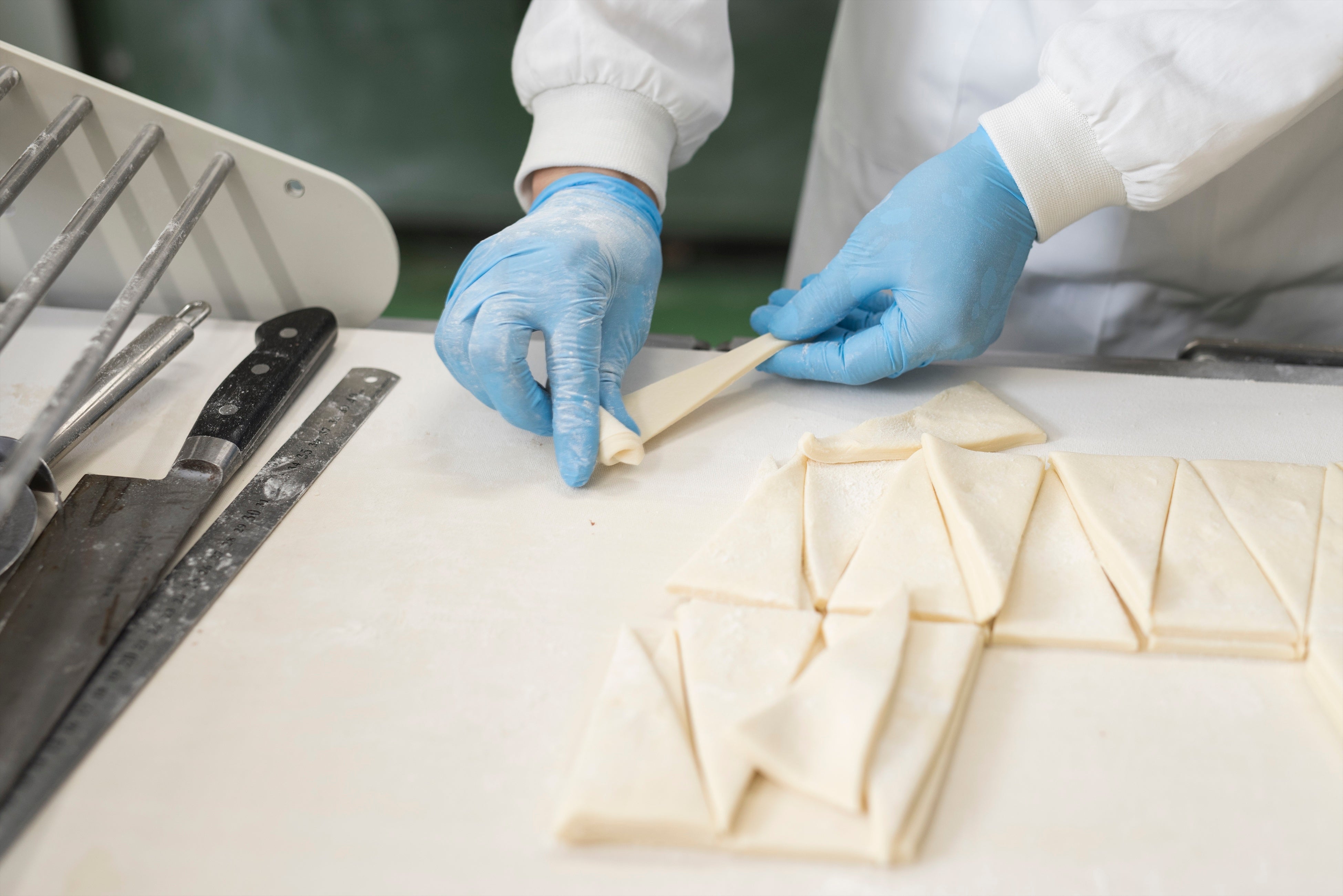 今では、全国13店舗分、毎日17万個以上の生地を “手折り製法” で製造しております。