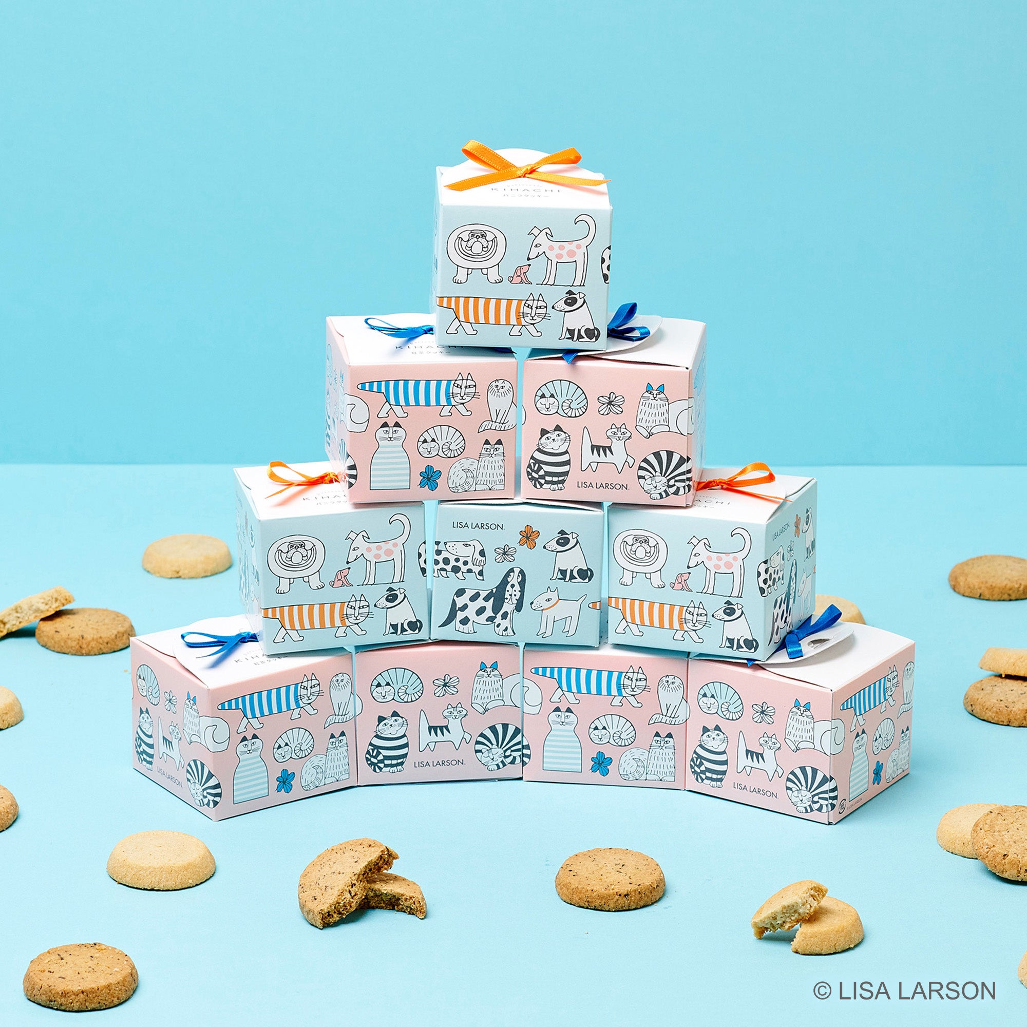 素材選びから丁寧に向き合い、本物の美味しさを追求するKIHACHIの焼菓子に、リサ・ラーソンの愛らしいキャラクターたちをあしらいました。定番の「スケッチねこ」やライオンの「レオ」、猫の「ミンミ」に加え、今年は犬好きの方からも要望の多かった「スケッチいぬ」シリーズが新たに加わり、春のギフトをいっそう華やかに彩ります。