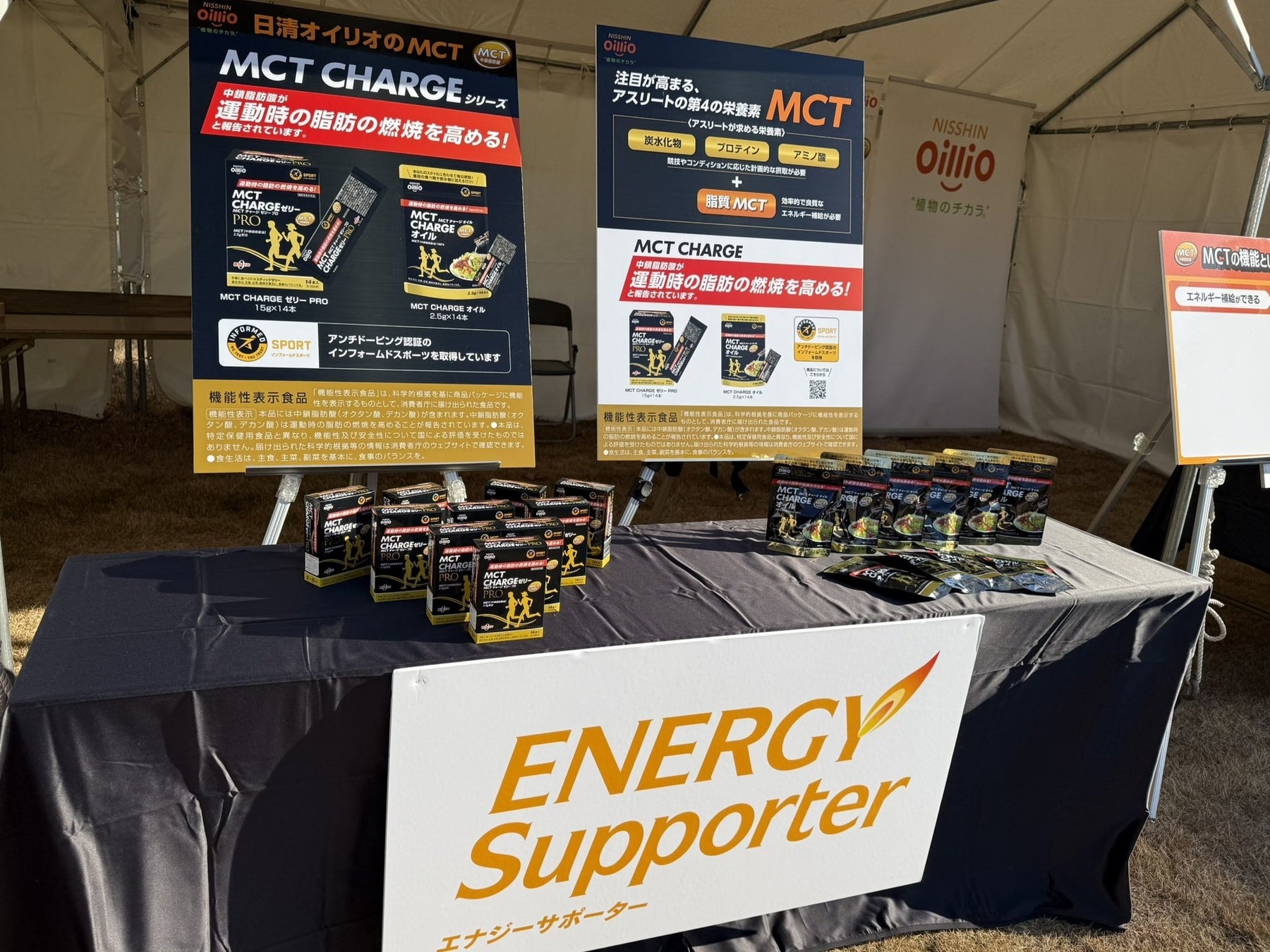 当社は、スポーツを愛するすべての人を応援する“ENERGY Supporter”として様々なスポーツ大会のサポート、ブースの出展を行っています。今大会では、横浜磯子事業場内のグラウンドに、アスリートも注目している成分「MCT」を紹介するブースを出展し、「中鎖脂肪酸が運動時の脂肪の燃焼を高める」機能性表示食品「MCT CHARGE オイル」が入った甘酒を提供。多くのランナーや来場された皆さまに、MCTの魅力を実感いただきました。