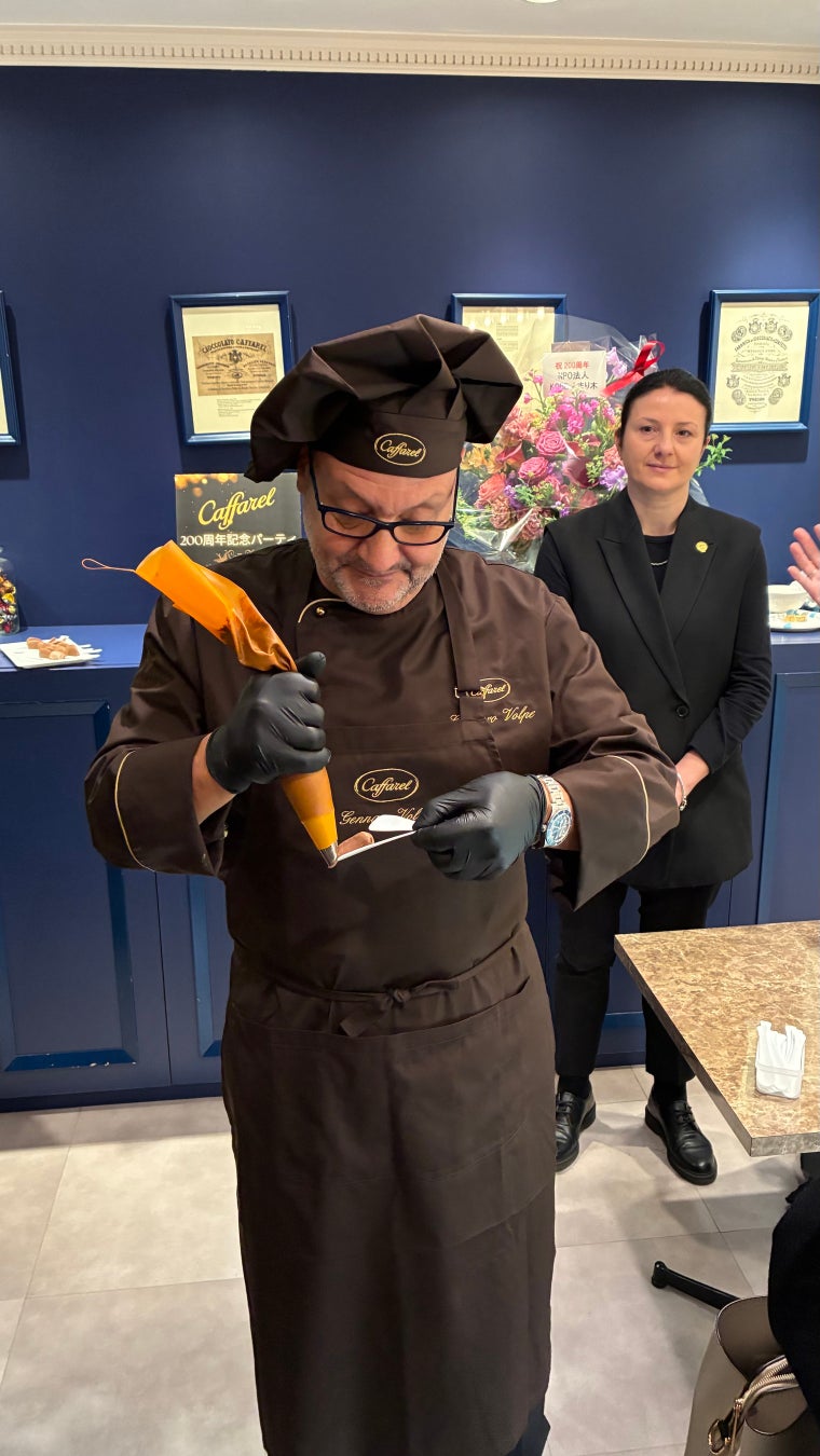 カファレル神戸北野本店で開催された「200周年記念パーティ」では、カファレルアンバサダーパスティッチェーレ、ボルぺ氏が来日。目の前で絞り出されたジャンドゥーヤや、作り立てのピエモンテをご試食。作り立てならではのふんわりとした柔らかさと濃厚なヘーゼルナッツの芳醇な香りをお楽しみいただきました。さらに、ボルぺ氏と一緒にジャンドゥーヤの絞り出し体験も。貴重な体験機会となりました。