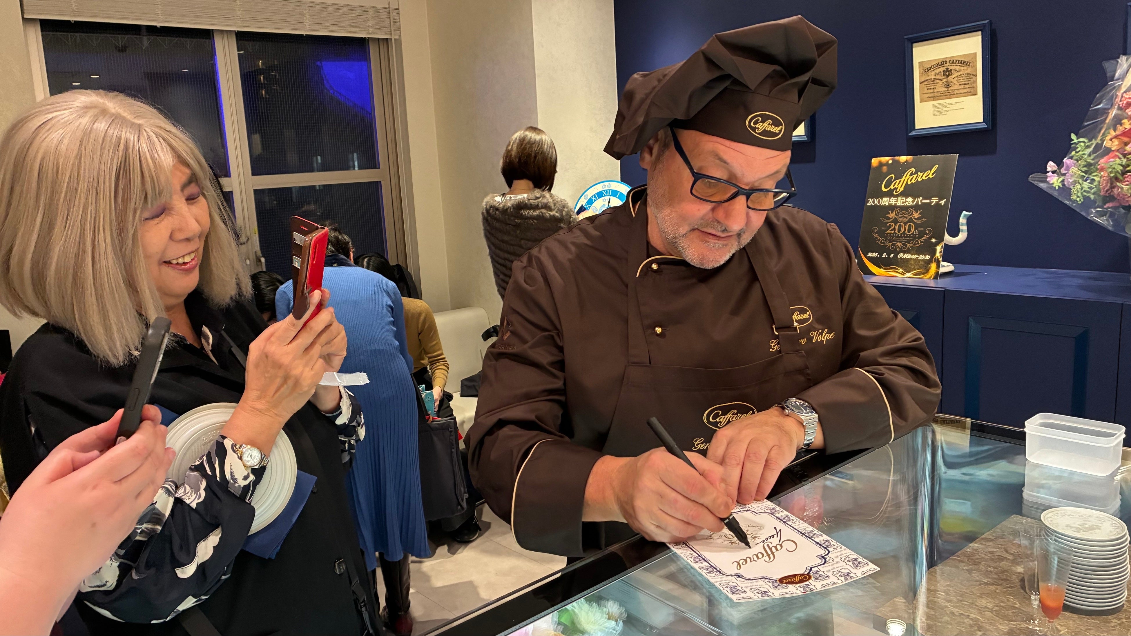 カファレル神戸北野本店で開催された「200周年記念パーティ」では、カファレルアンバサダーパスティッチェーレ、ボルぺ氏が来日。目の前で絞り出されたジャンドゥーヤや、作り立てのピエモンテをご試食。作り立てならではのふんわりとした柔らかさと濃厚なヘーゼルナッツの芳醇な香りをお楽しみいただきました。さらに、ボルぺ氏と一緒にジャンドゥーヤの絞り出し体験も。貴重な体験機会となりました。