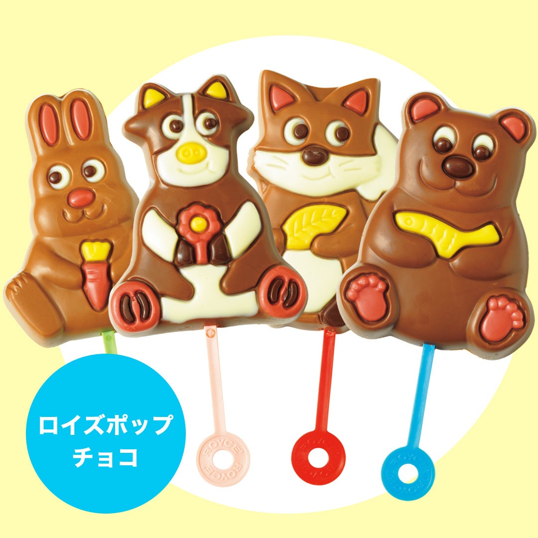 「ロイズポップチョコ」のクマを乗せた、後ろに引っ張り手を離すと前に進むプルバック式の飛行機のおもちゃ。飛行機のサイズは約6.5cm、デザインは5種類です。