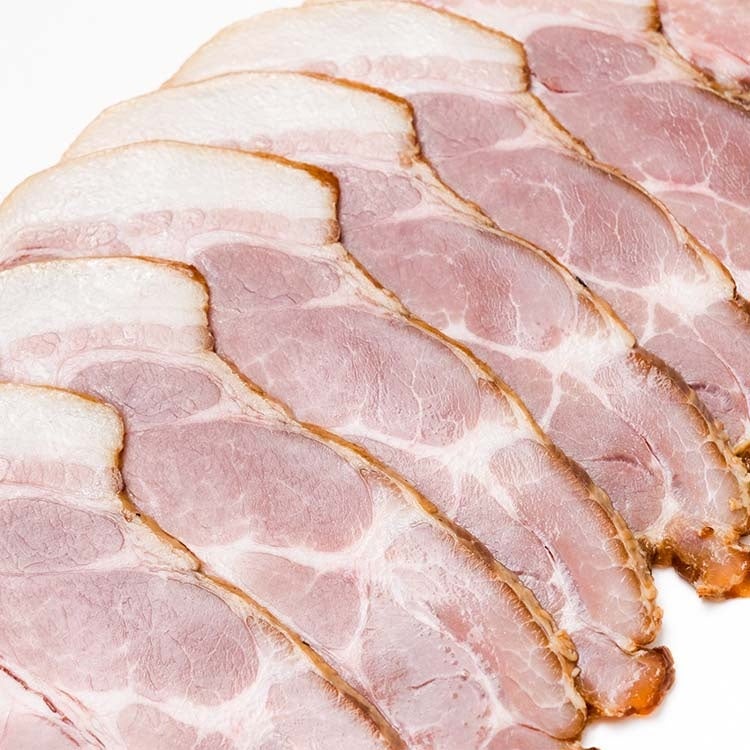 本製品は、一般的なベーコンに使用されることの多いバラ肉ではなく、赤身と脂身のバランスが優れた「国産豚肩ロース」を使用したこだわりのベーコンです。