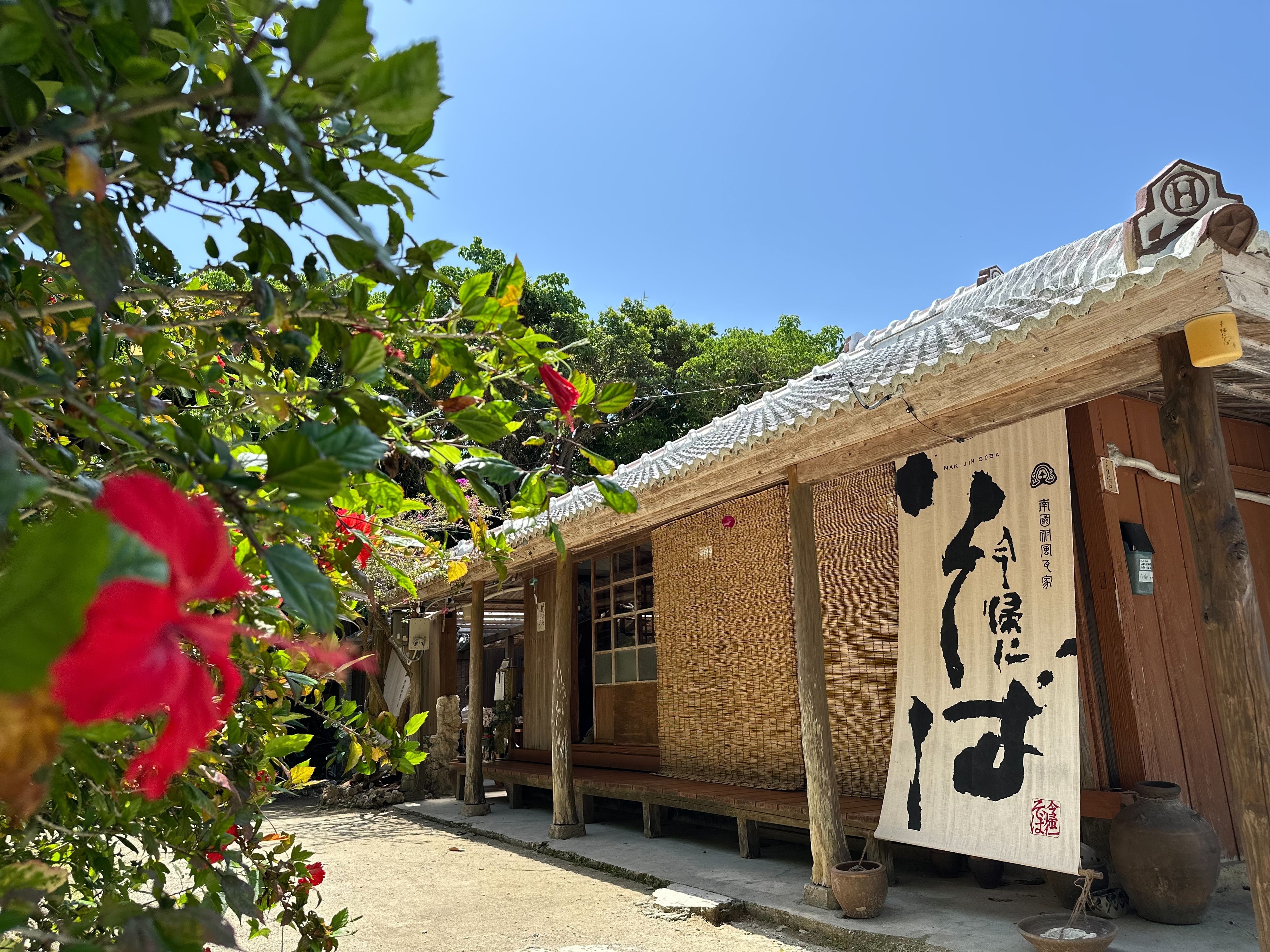 沖縄美ら海水族館(車10分)や、新テーマパーク「JUNGLIA」(車20分)からのアクセスも良好な当店は、フクギ並木に囲まれた古民家を改装した沖縄そば専門店です。 素材からこだわった出汁と特製麺が生み出す本格的な味わいは、観光のお客様のみならず、地域の皆様からも厚い支持をいただいております。 沖縄の伝統的な風景の中で、心安らぐひとときを提供いたします。