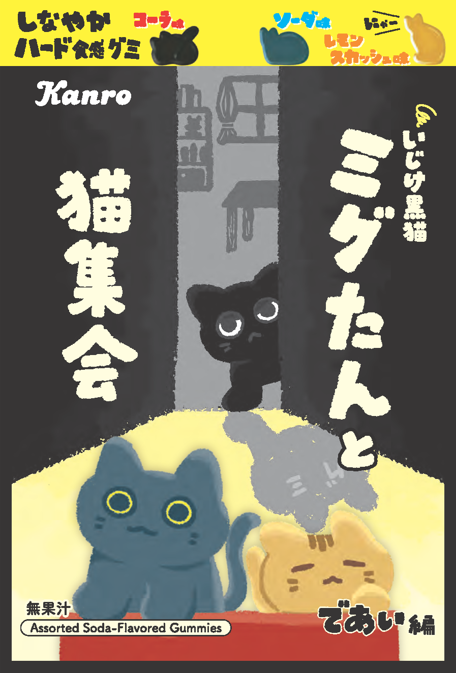 フレーバーはコーラ味(黒色)、レモンスカッシュ味(茶色)、ソーダ味(灰色)の3種のアソート。グミ粒は猫シルエット型3種のほか、レア型として双子の猫グミを潜ませています。