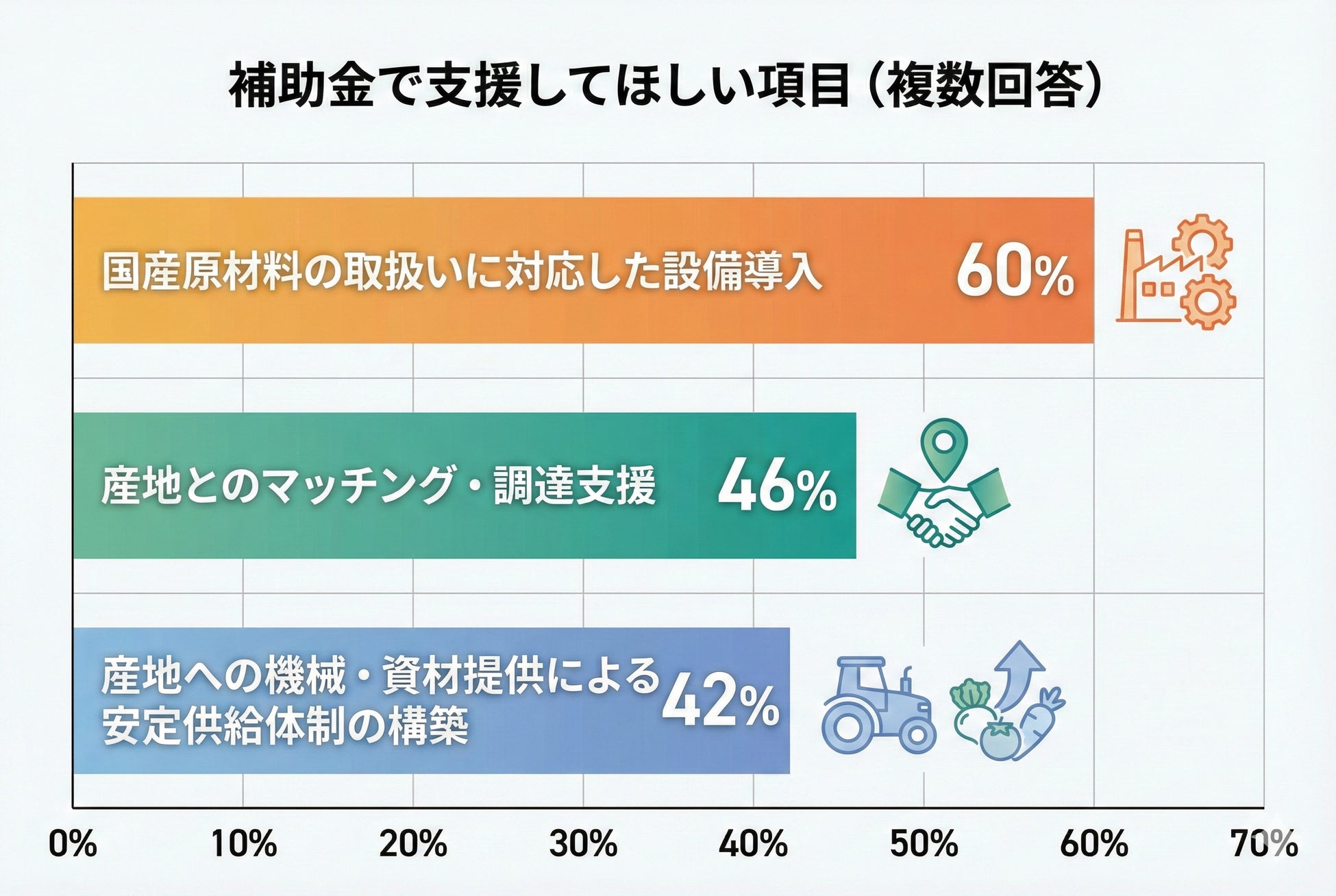 「産地とのマッチング・調達支援」(46%)、「産地への支援を通じた安定供給体制」(42%)など、産地連携に関する支援ニーズが高いことがわかりました。