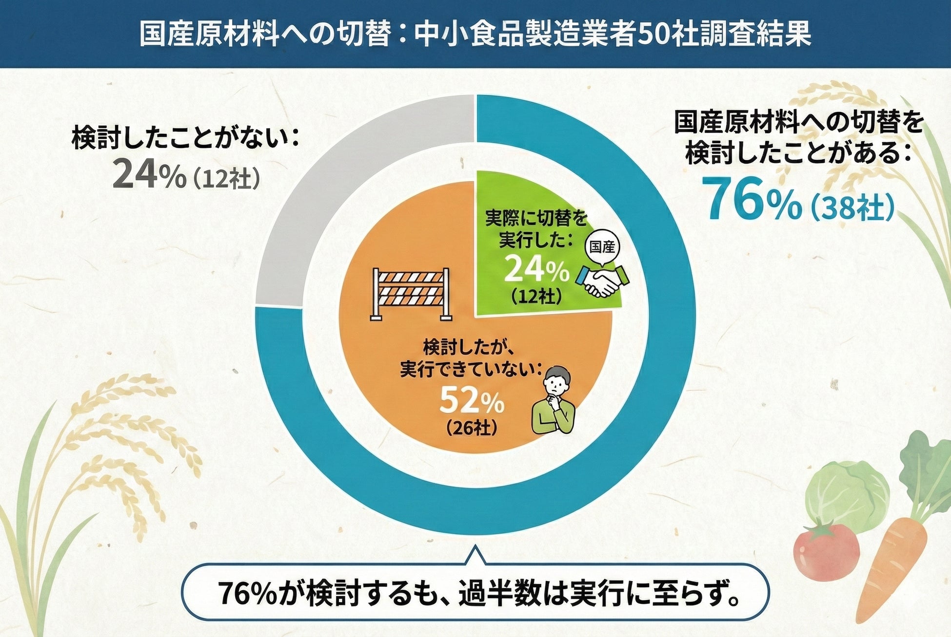 その結果、国産原材料への切替を検討した企業のうち、実際に切替を実行できたのはわずか24%にとどまり、76%が「検討したが実行できていない」ことが明らかになりました。