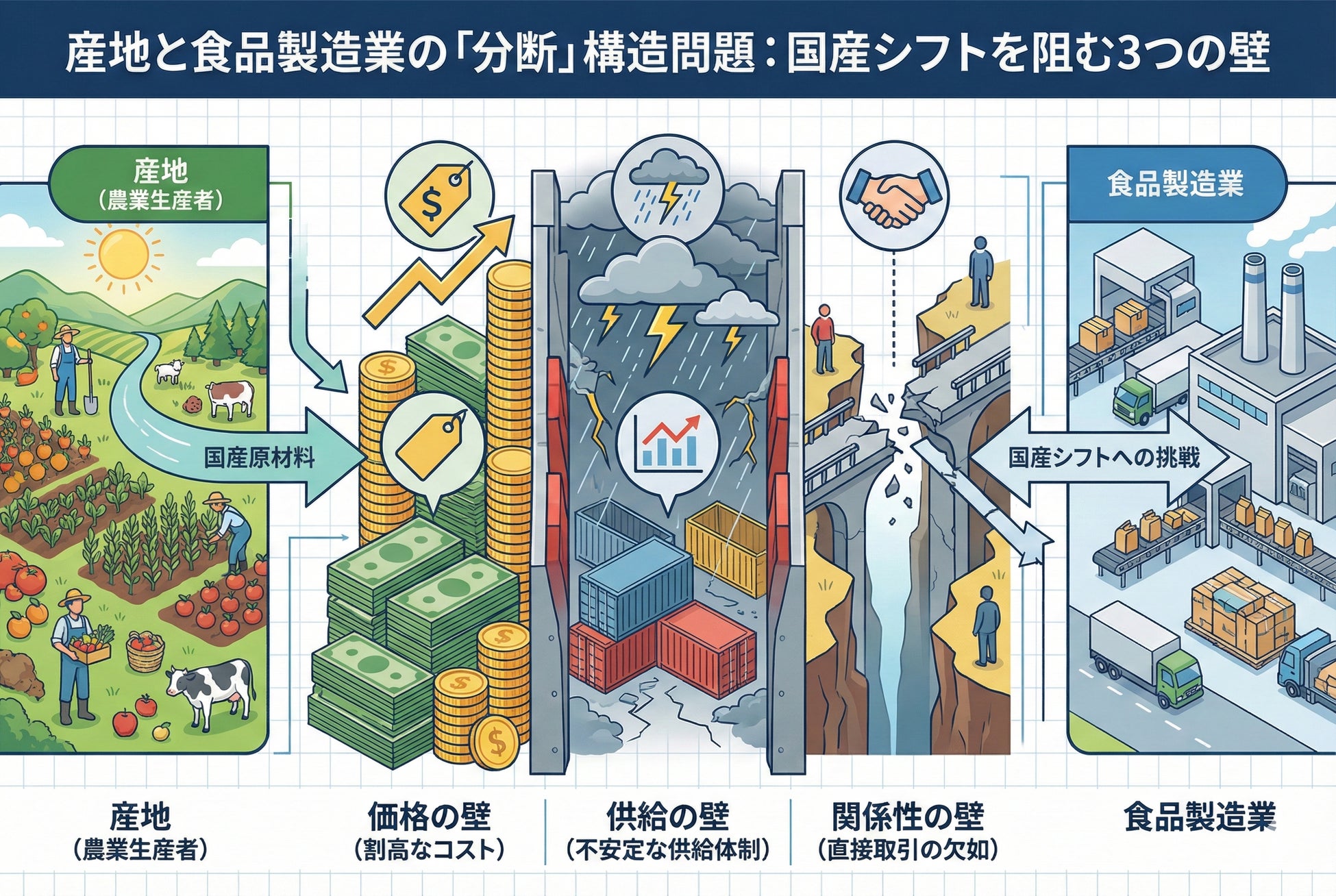 食品製造業と農業生産者の間には長年の「分断」があり、個社の努力だけでは乗り越えられない構造的な課題となっています。