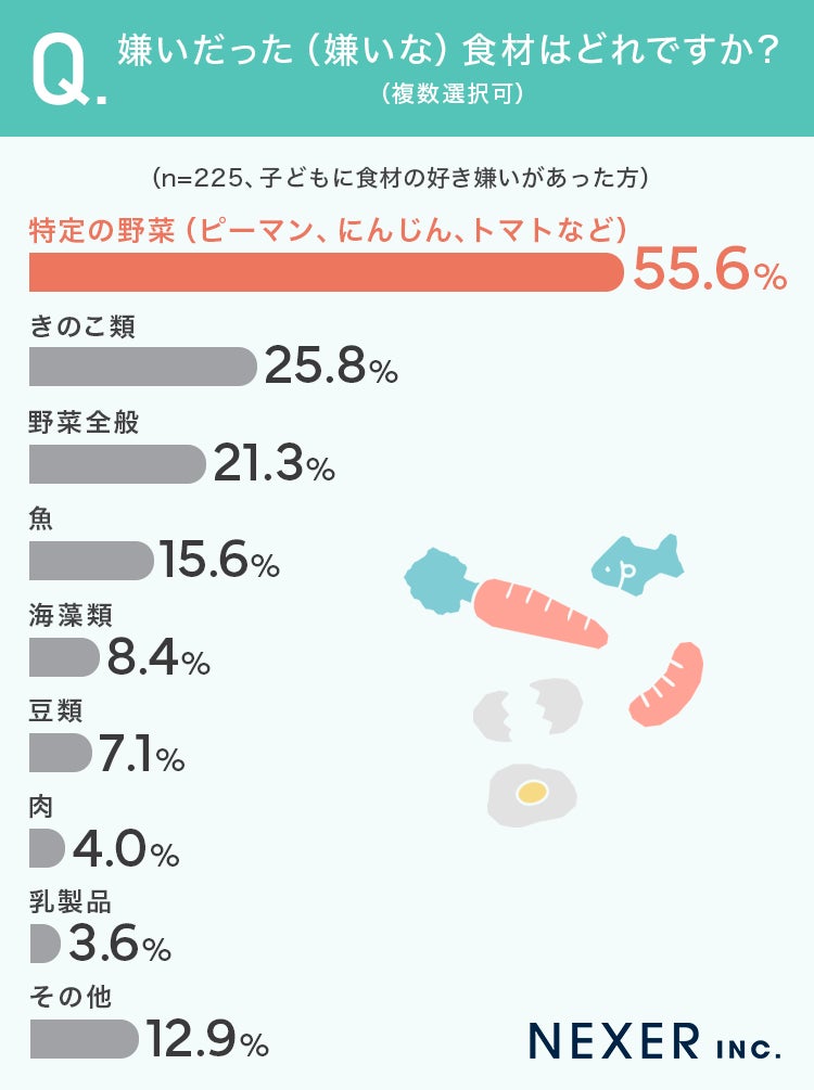 最も多かったのは「特定の野菜(ピーマン、にんじん、トマトなど)」で55.6%でした。次いで「きのこ類」が25.8%、「野菜全般」が21.3%、「魚」が15.6%と続きます。