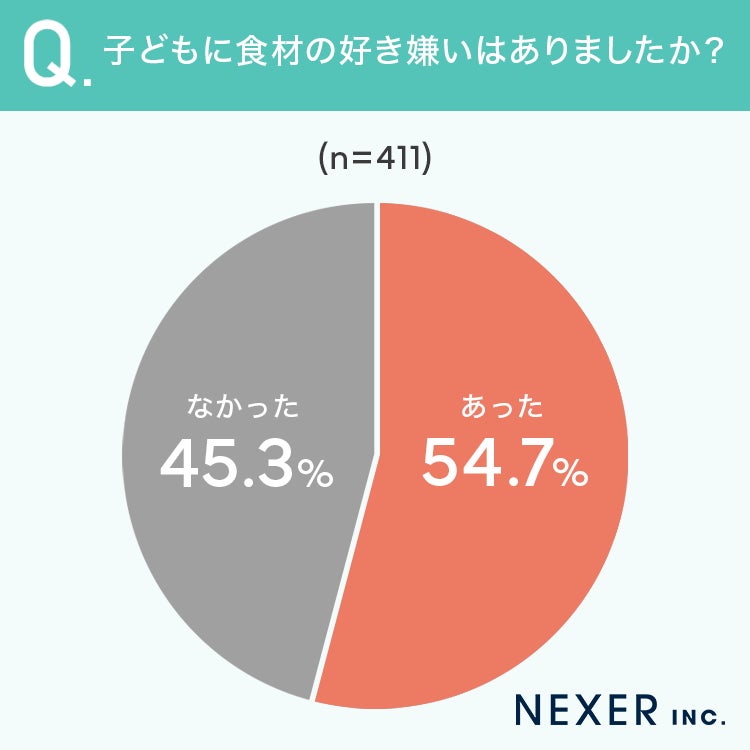 その結果「あった」と回答した人は54.7%、「なかった」は45.3%でした。半数を超える家庭で、子どもの好き嫌いを経験していることがわかります。