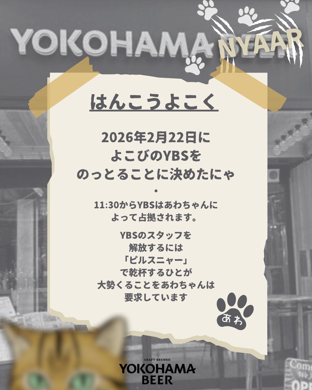 昨年2025年2月22日、横浜ビールの看板商品であるピルスナーを鮮やかに乗っ取り、「ピルスニャー」を誕生させた猫の「あわちゃん」。 あれから1年……。虎視眈々ともっと大きな野望を目論んでいたあわちゃんが、ついに実店舗の完全占拠を強行します。