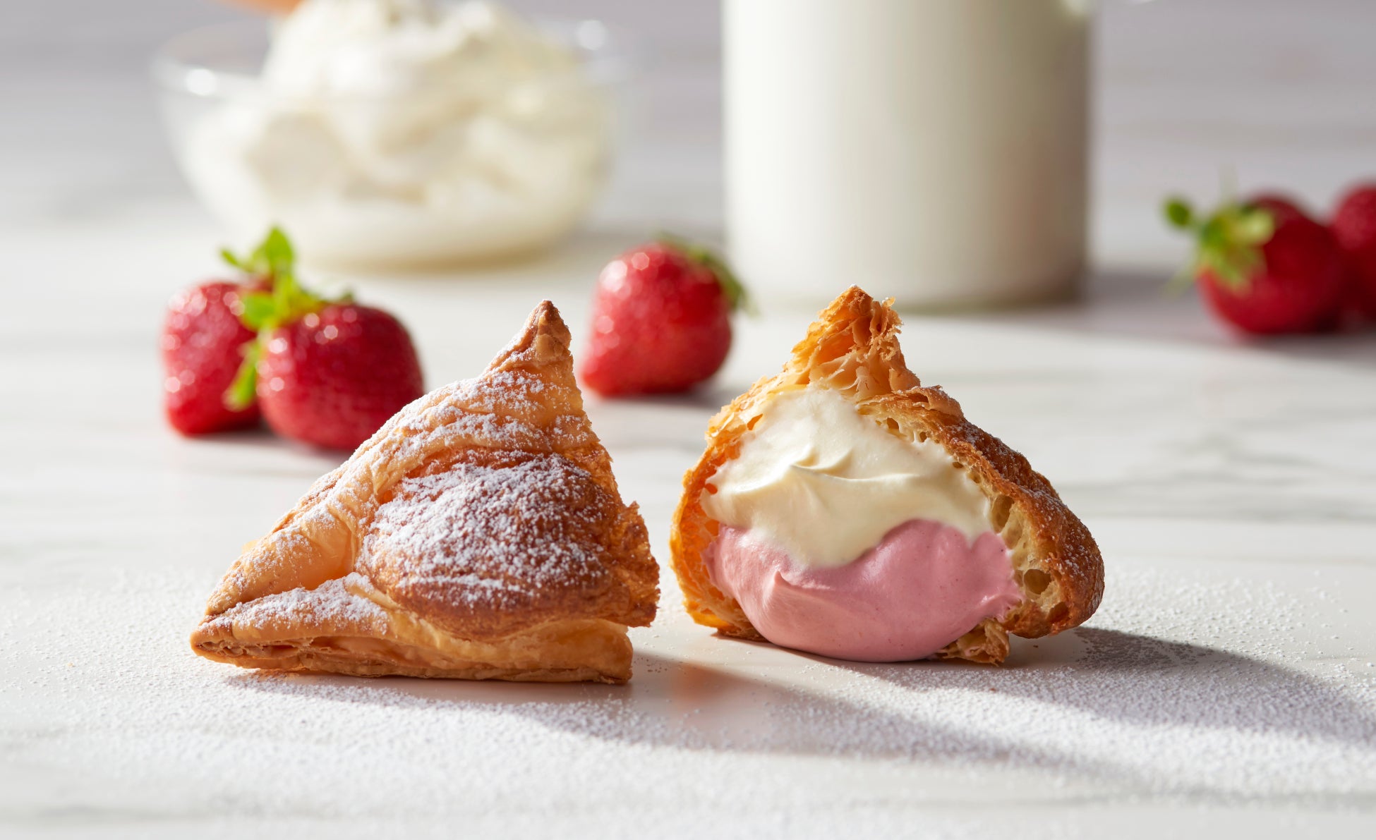 『ミルクパイ ストロベリー』は、自慢のサクサクパイに、北海道製マスカルポーネチーズと生クリームを合わせたまろやかなミルククリームと、いちごの果汁を加えた甘酸っぱいストロベリークリームを閉じ込めました。まるでいちごミルクの様な優しい味わいをお楽しみいただけます。