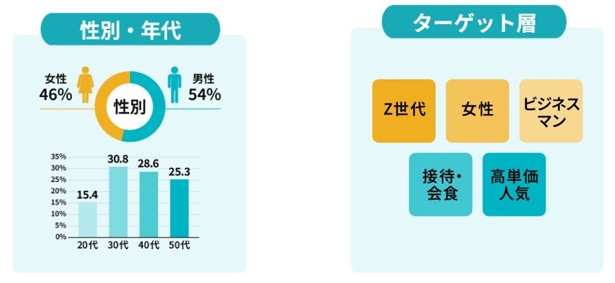 ミセメディア導入店には、性別・年齢・利用シーンなどが異なる幅広い来店客が訪れています。今回のアップデートにより、プロモーションの目的に合わせて、ターゲット層(性別・年齢・シーン・属性など)に応じた飲食店のセグメントが可能となりました。また、目的・予算に合わせて最小10店舗での実施から対応いたします。