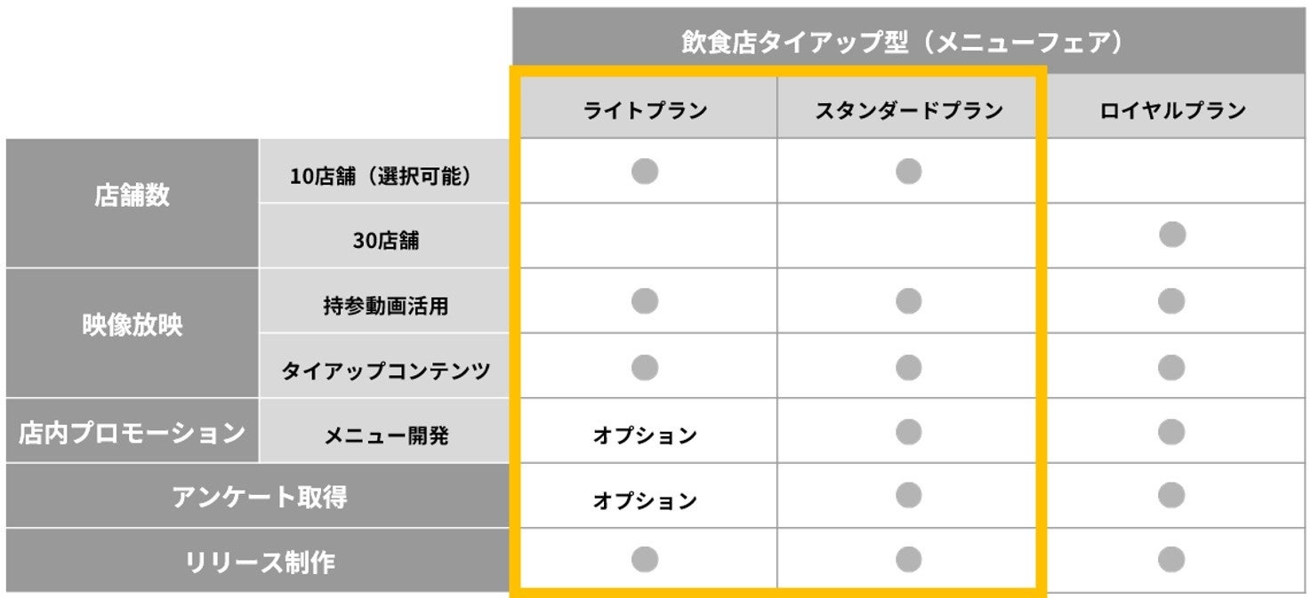 ・ライトプラン:飲食店タイアップメニューの開発や来店客アンケートを行わない小規模な実施を希望する方向け、実施店舗の選定が可能